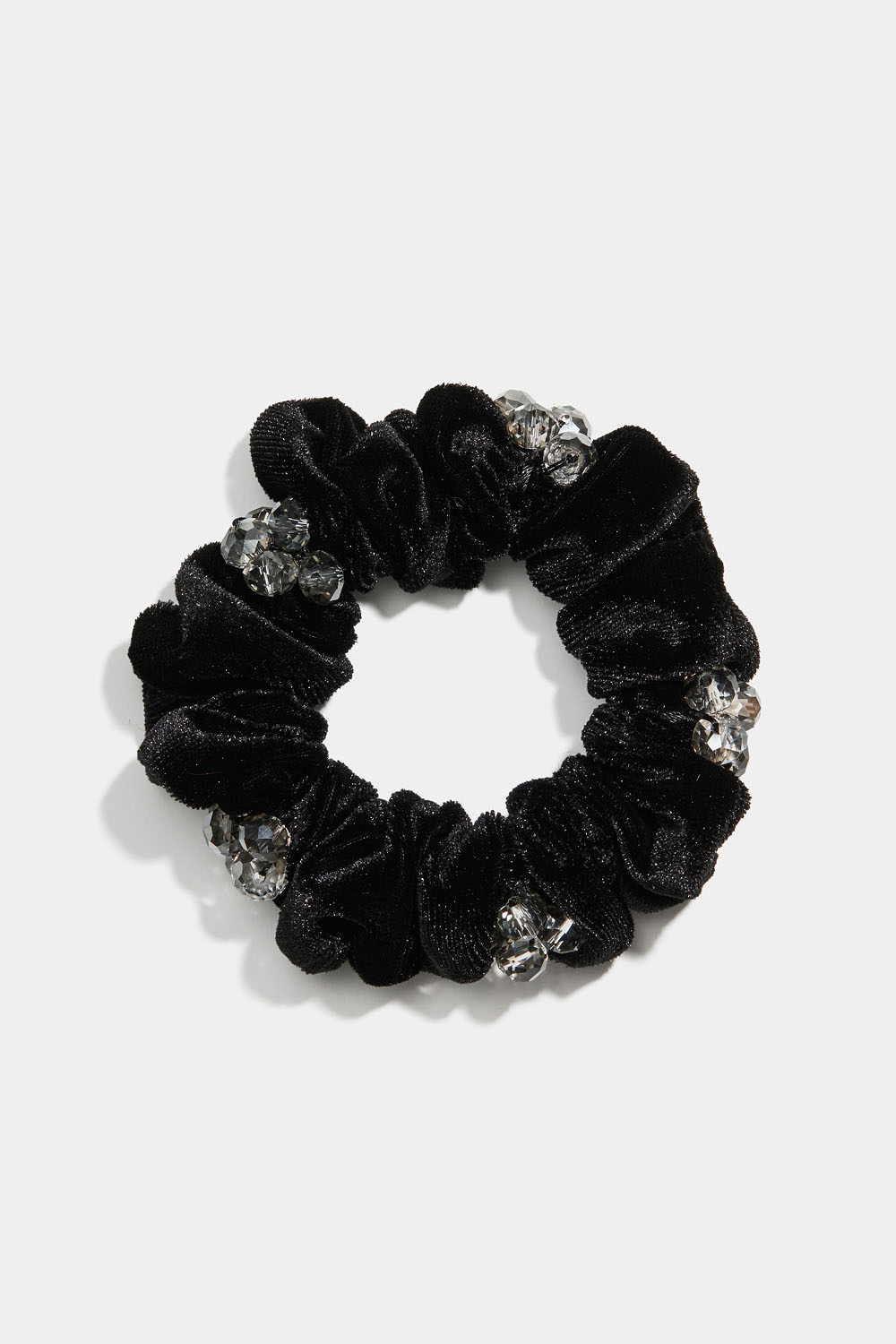Musta samettinen hiusdonitsi, joka on koristeltu harmailla läpinäkyvillä muovihelmillä.