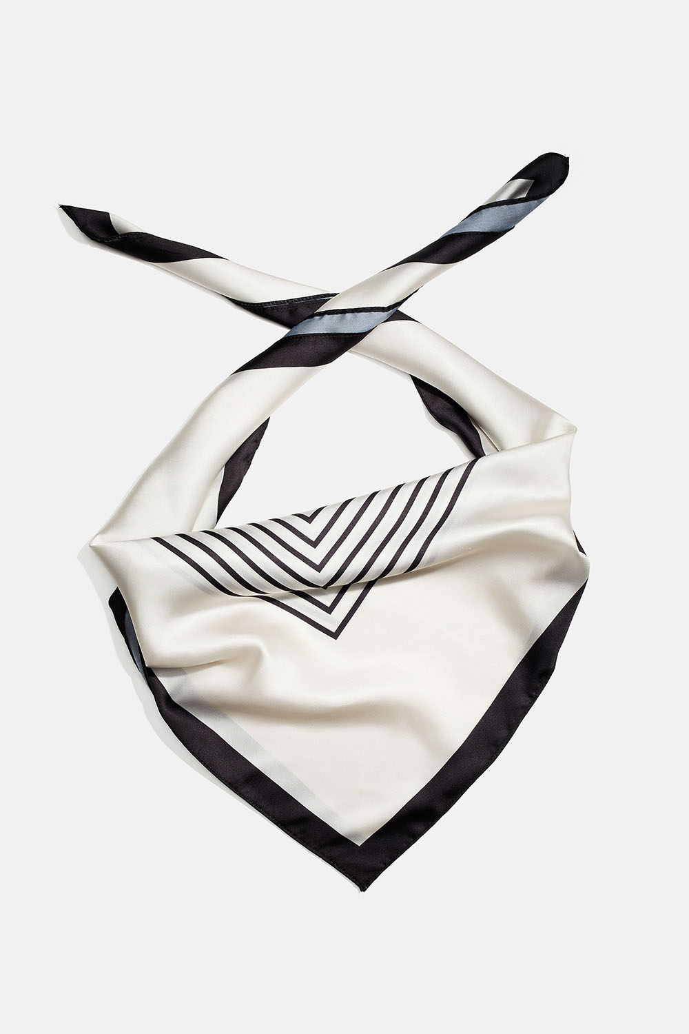 Neliön muotoinen mustavalkoinen satiinihuivi, jossa on graafinen kuvio. Voidaan käyttää myös hiusasusteena tai laukkukoristeena.