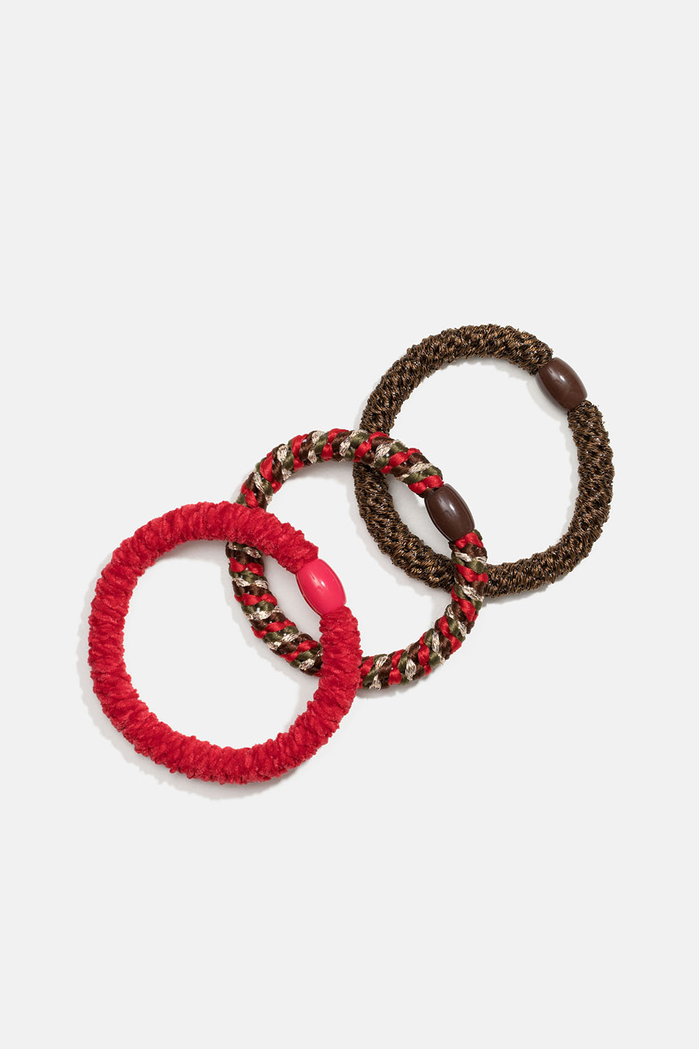 3 tukevaa ruskeaa, punaista ja vihreää hiuslenkkiä, joissa on väriltään yhteensopiva helmiyksityiskohta. Lenkit on punottu pienistä kuminauhoista, mikä tekee niistä erityisen joustavia ja hellävaraisia hiuksille. Kun et käytä niitä hiuksissasi, voit pitää niitä ranteessasi.