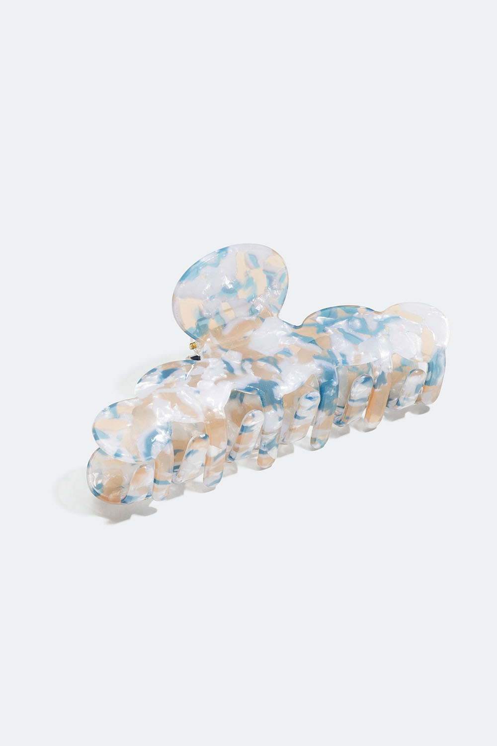 Kimalteleva hiusklipsi, jossa on meleerattu sininen ja valkoinen kuvio ja aaltoilevat reunat.