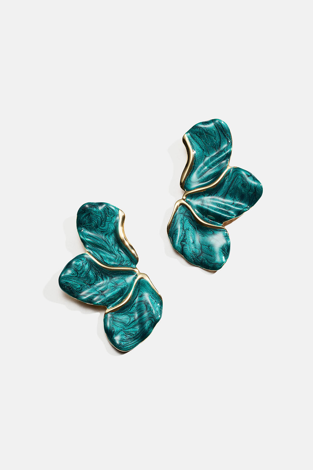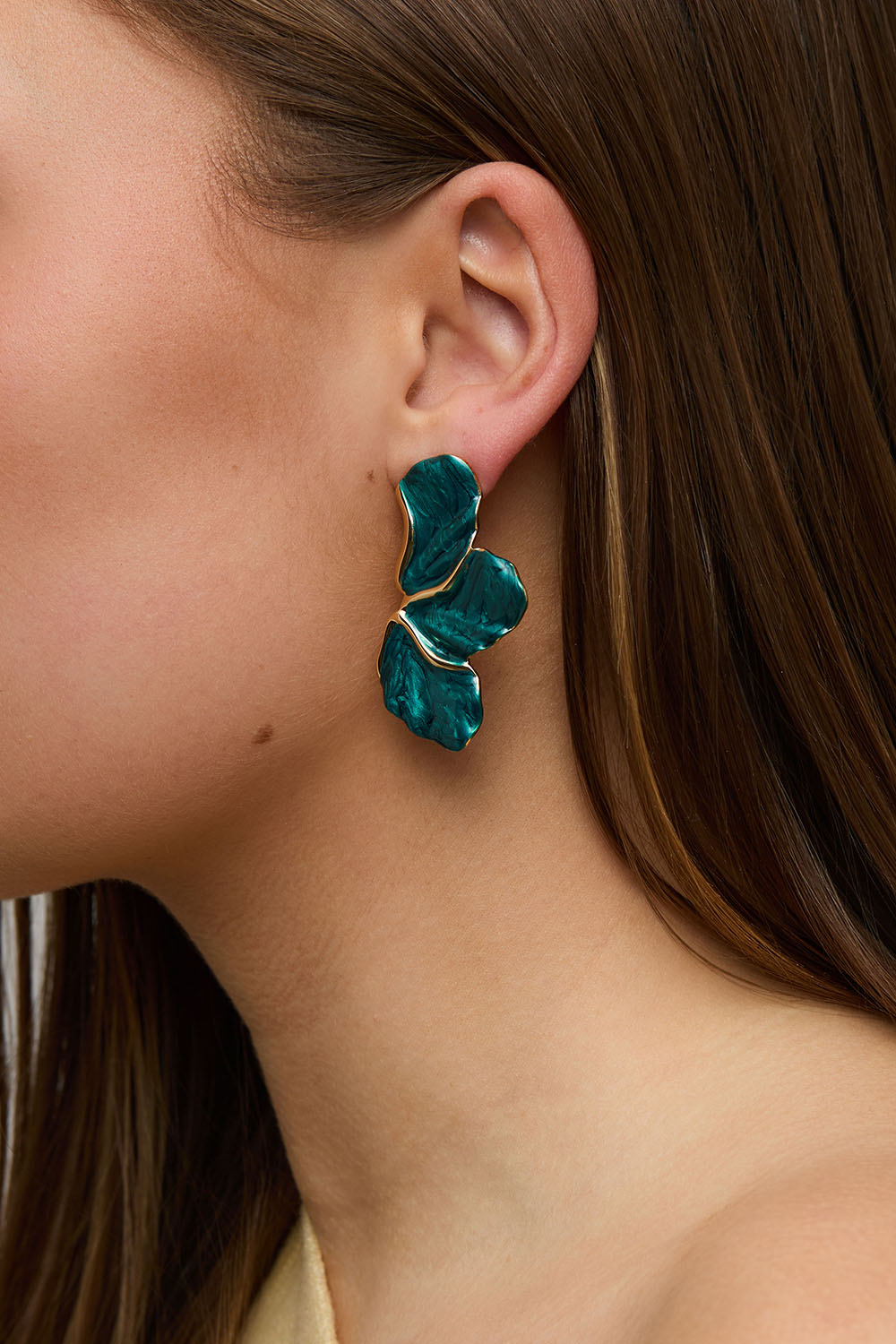 Suuret terälehtien muotoiset kullanväriset metallikorvakorut, joissa on petroolinsiniset emaliyksityiskohdat.