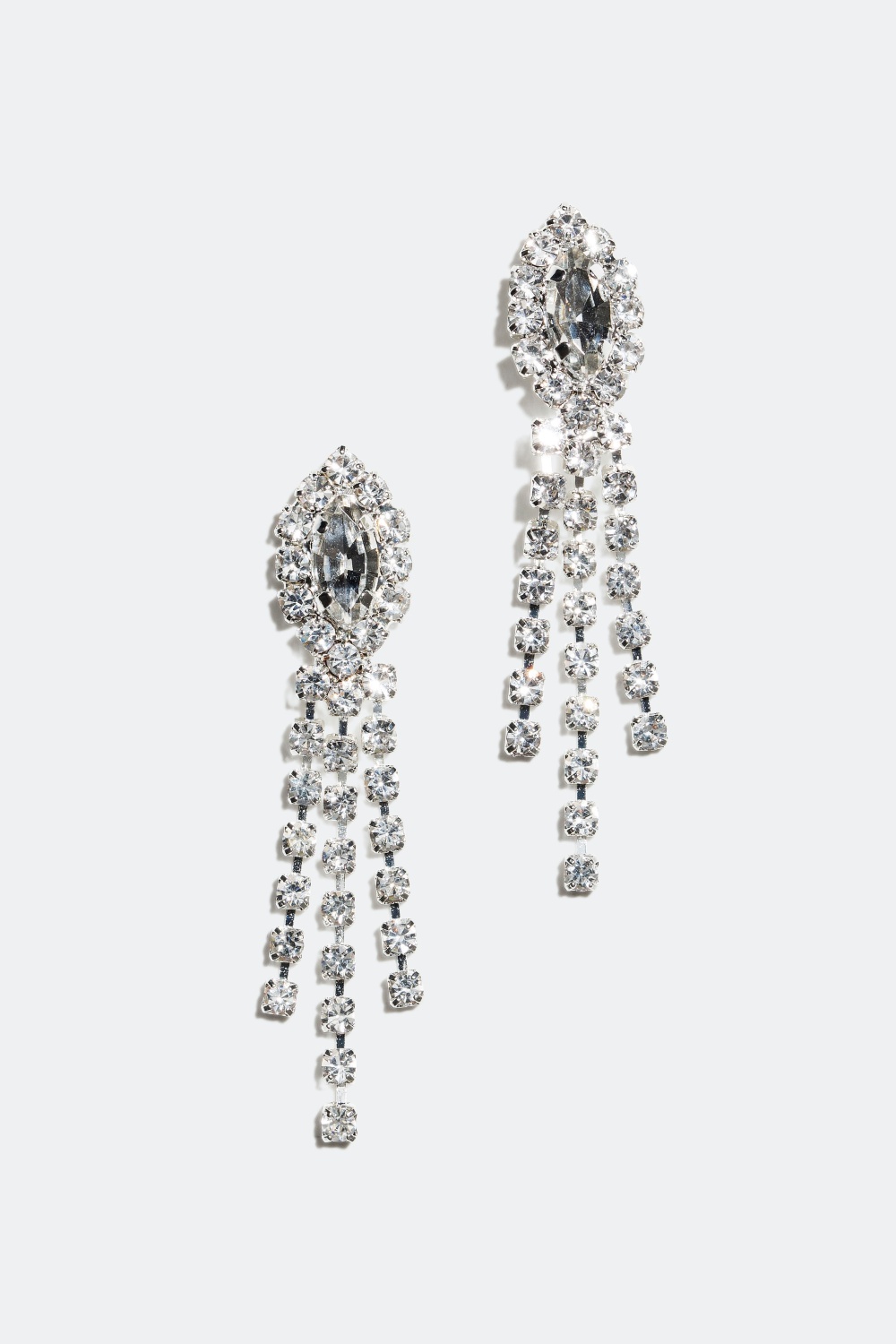 Roikkuvat strassikorvakorut, joissa on soikea kivi ja kolme eripituista lenkkiä.