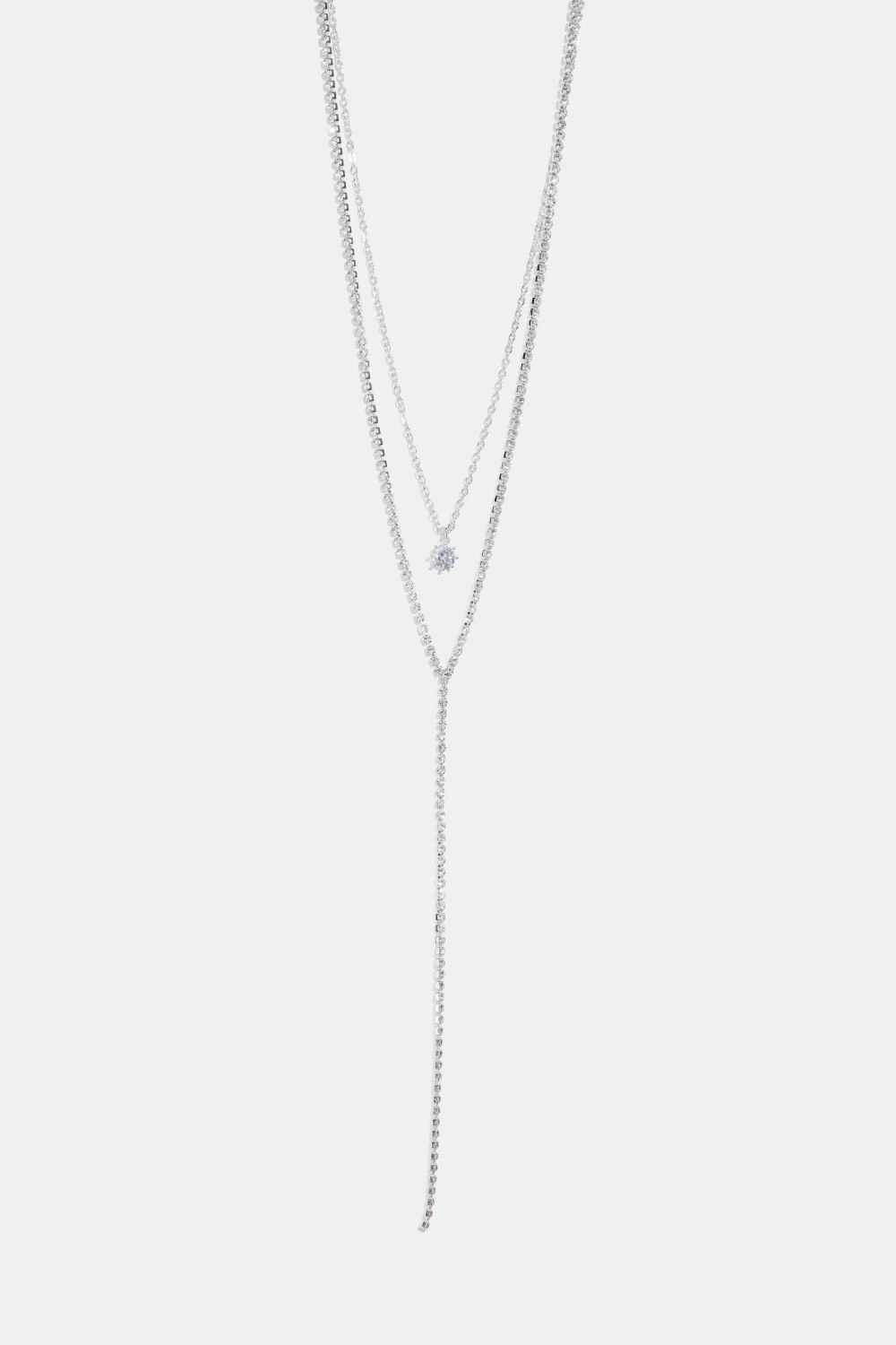 Tyylikäs strassikaulakoru eri kerroksissa kahdella ketjulla. Lyhyemmässä on iso lasikivi ja pidempi on koristeltu lasikivillä.