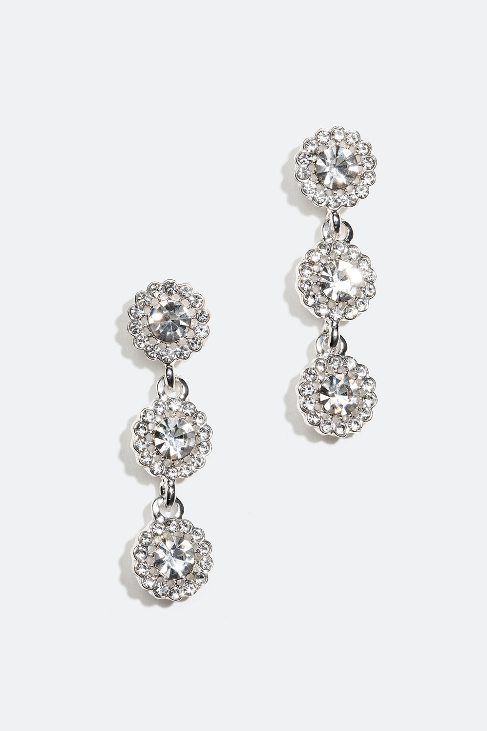 Kimaltavat strassikorvakorut, joissa on kolme pyöreää lasikiveä ja pieniä lasikiviä niiden ympärillä.