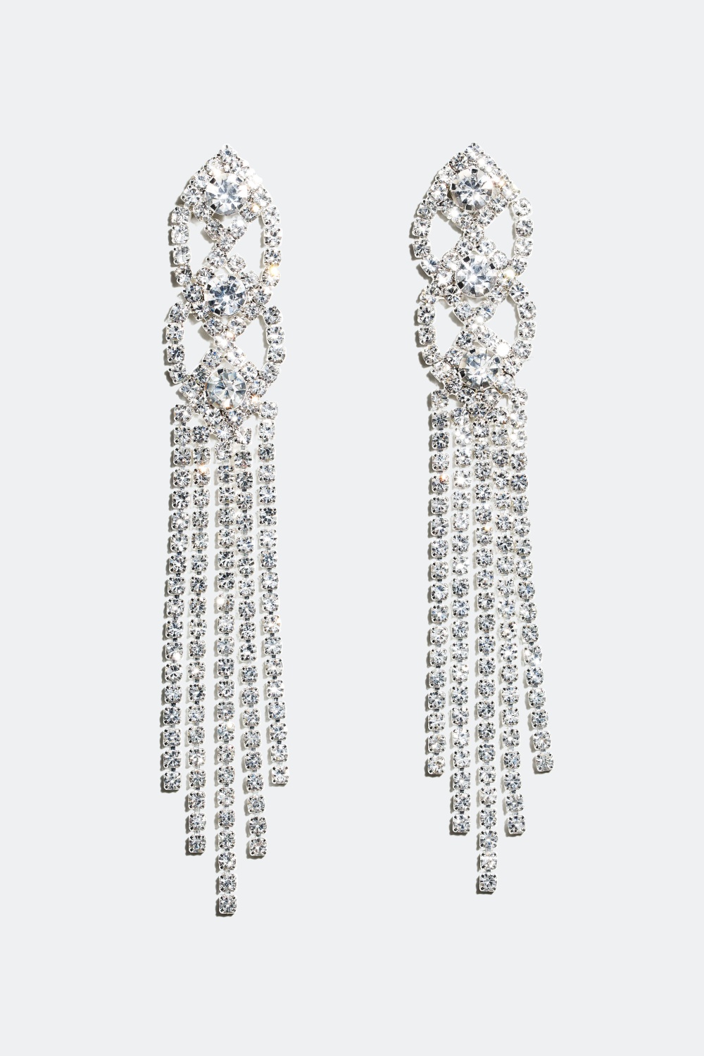 Pitkät, kauniit strassikorvakorut, joissa on kupera kuvio sekä viisi roikkuvaa lenkkiä.