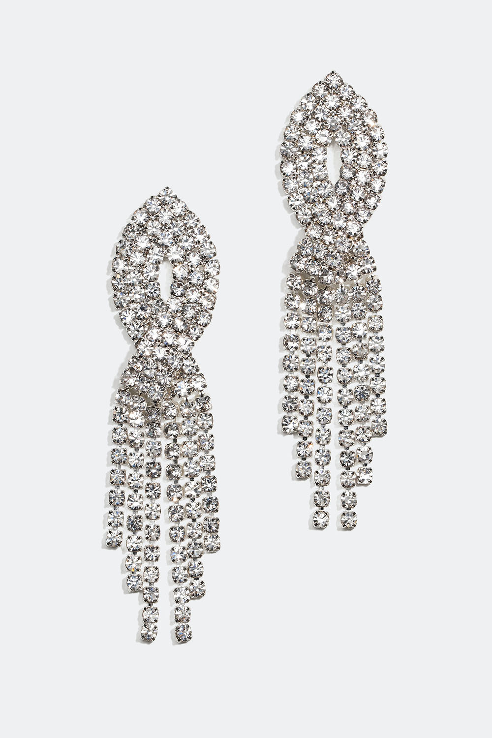 Strassikorvakorut, joissa on kolme päällekäin asettuvaa ketjua koristeltuna kimaltelevilla lasikivillä. Juhlavat korvakorut, jotka tuovat hieman ekstraa asuusi.
