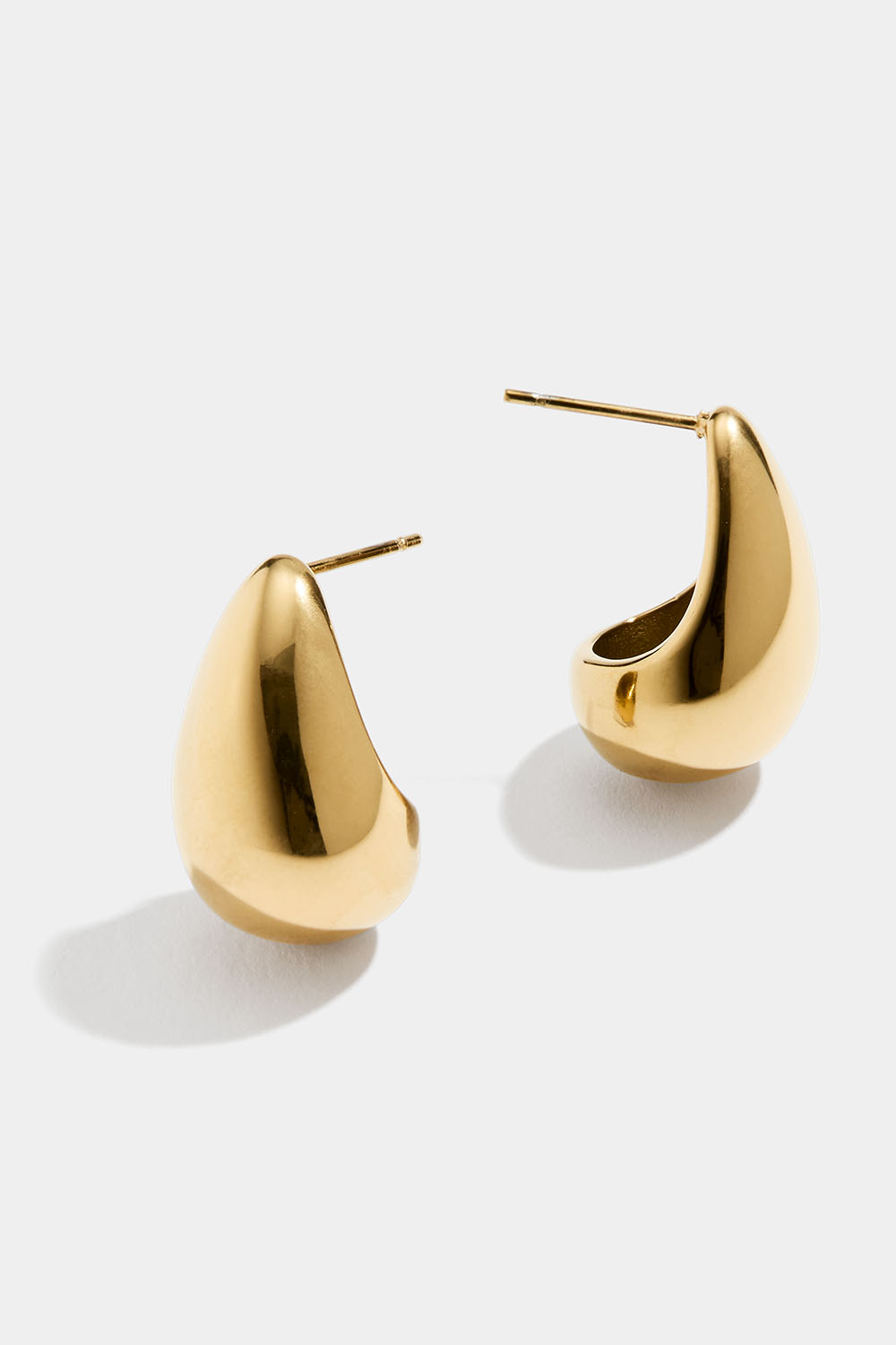 Korkeakiiltoisesta, ruostumattomasta teräksestä valmistetut pisaran muotoiset isommat korvakorut, jotka on PDV-pinnoitettu 18k kullalla.