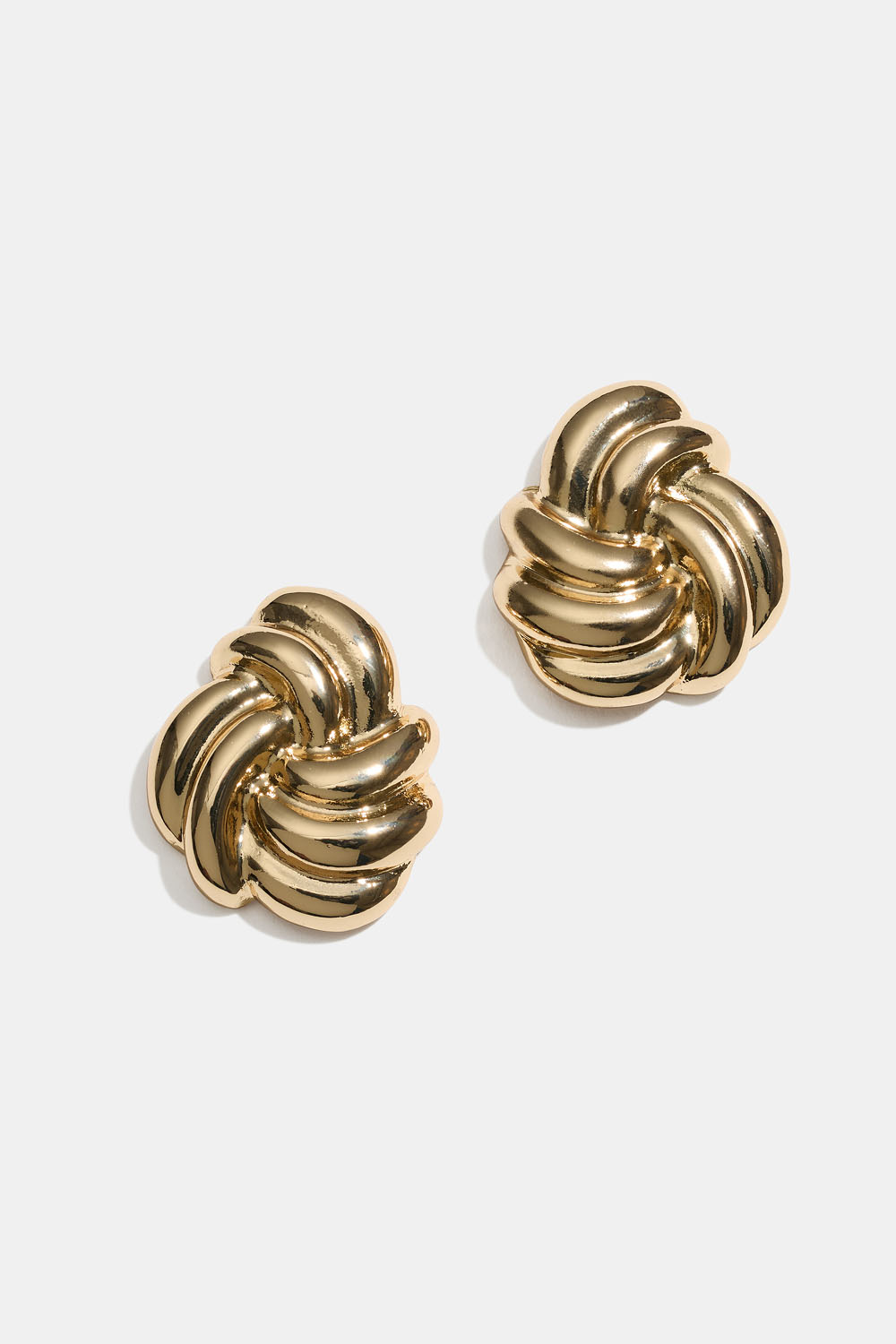 Suuret kullanväriset metallikorvakorut, joissa on solmu.