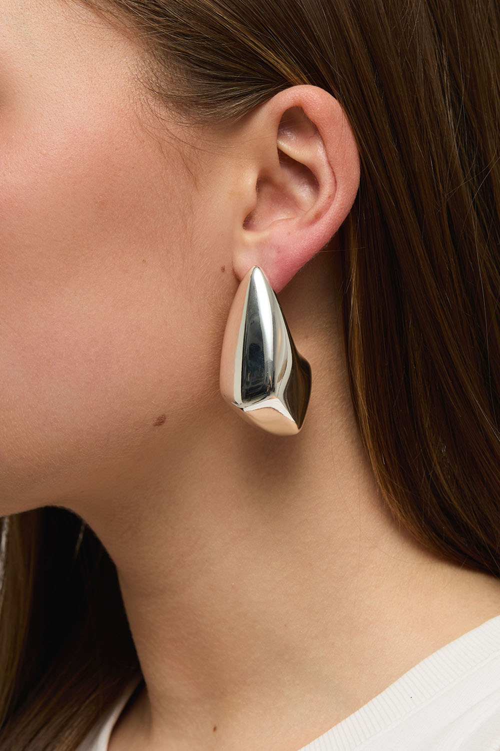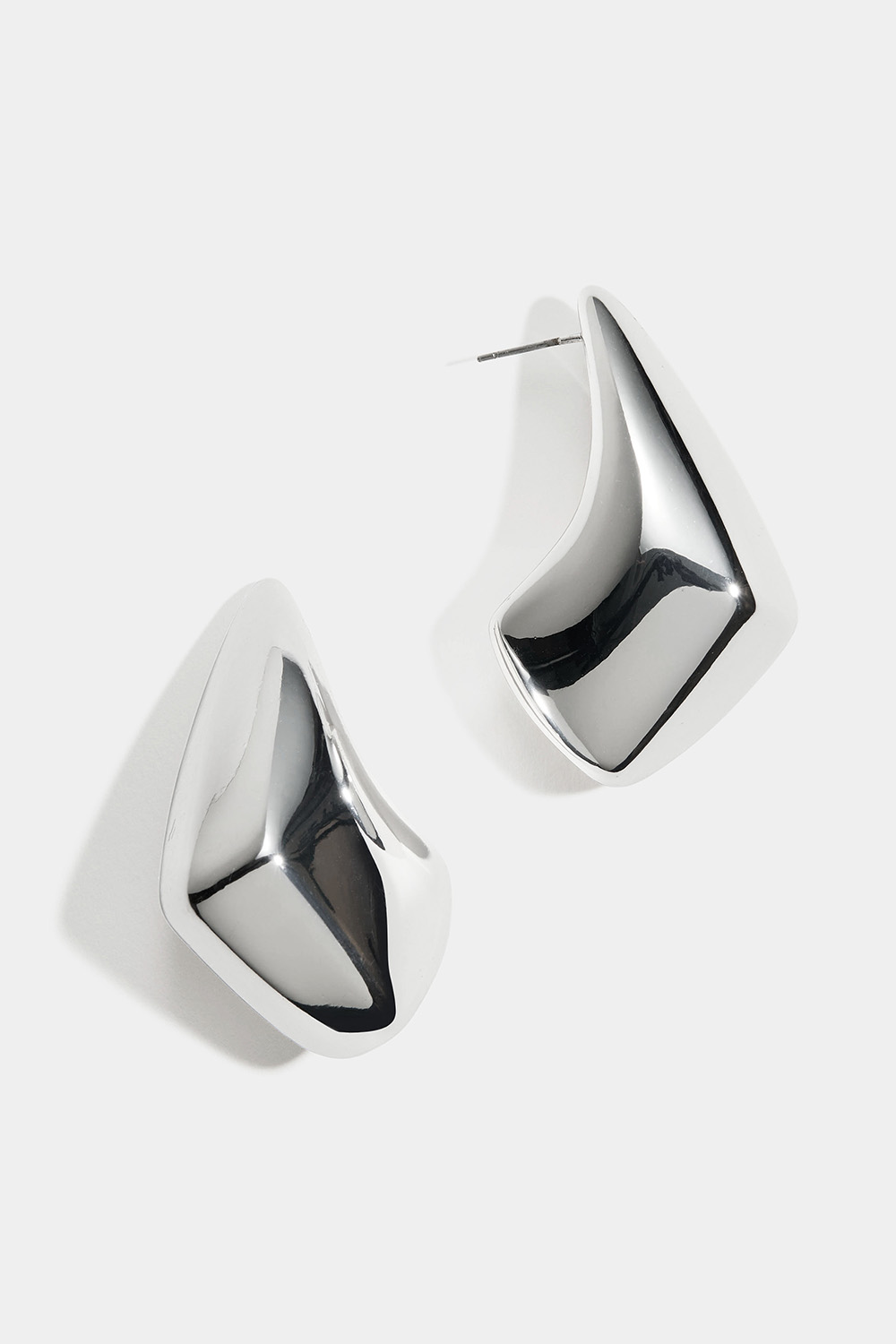 Suuret ja kiiltävät hopeanvärist korvakorut, jotka ovat kulmikkaiden pisaroiden muotoiset.
