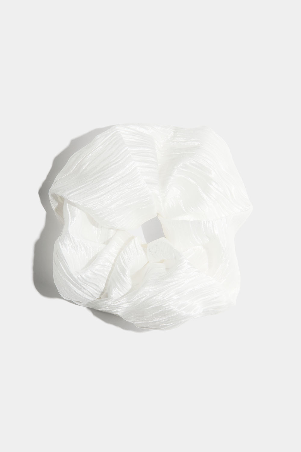 Suuri hiusdonitsi hohtavan valkoista pliseerattua kangasta.