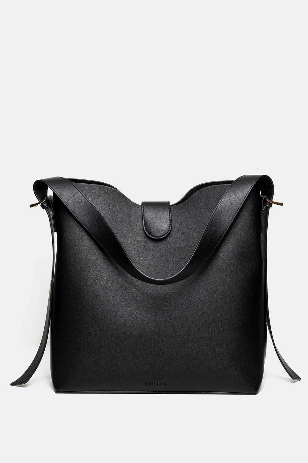 Suuri musta käsilaukku, jonka etupuolella on painettu Don Donna -logo. Olkahihna on irrotettava ja säädettävä, joten laukkua voi kantaa myös crossbody-tyyliin. Mukana on myös pienempi sisäänommeltu sisäpussi, joka voidaan sulkea vetoketjulla. Täydellinen, tilava asuste vaikkapa töihin.