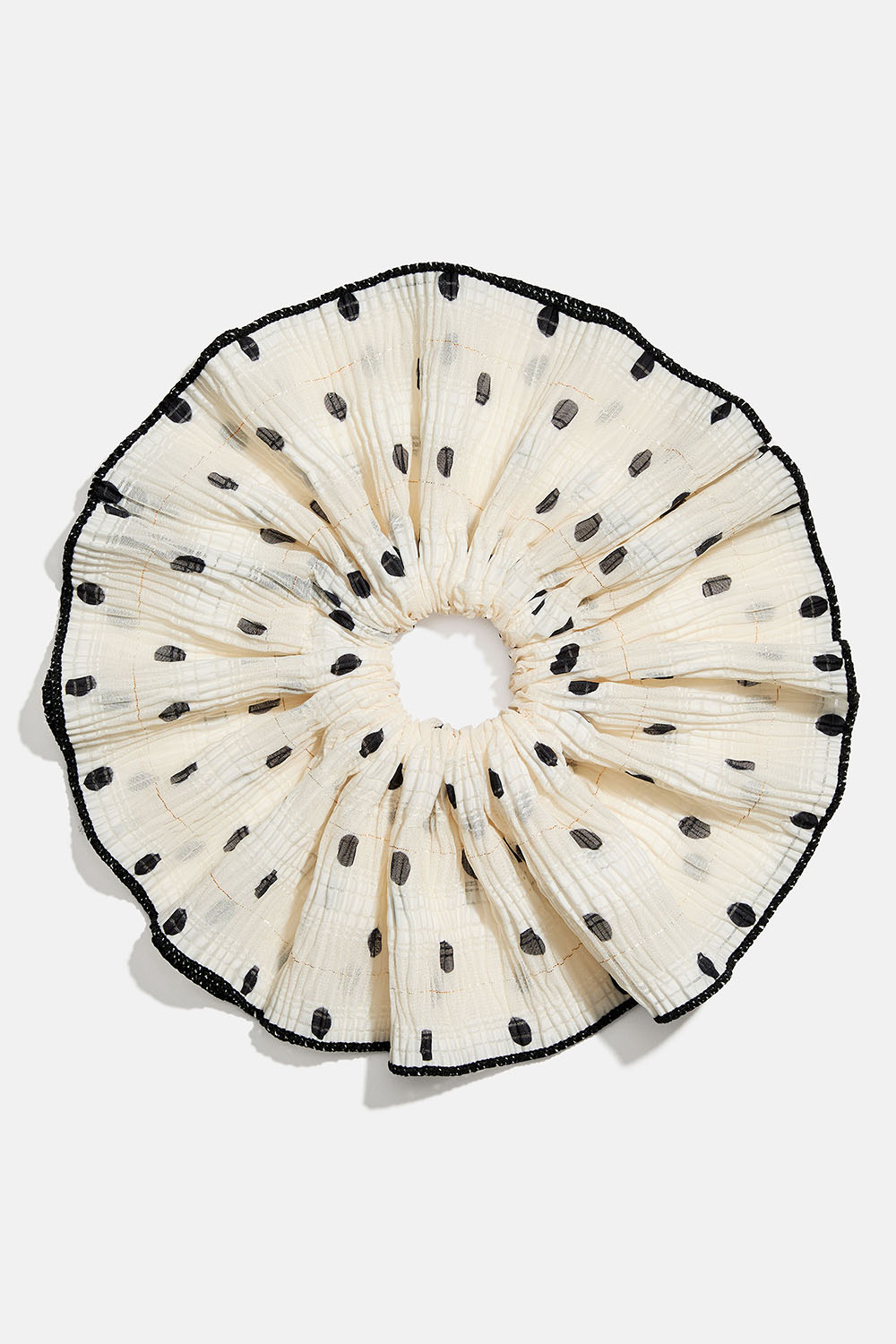 Suuri valkoinen hiusdonitsi pliseeratusta kankaasta, jossa mustia pilkkuja ja musta reuna.