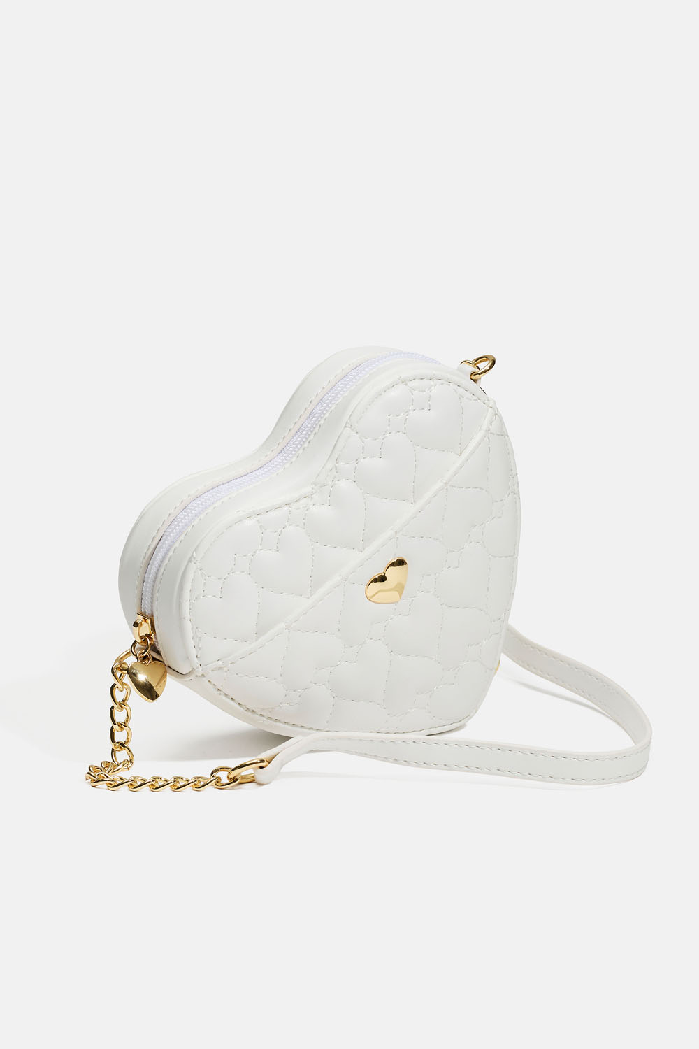 Sydämen muotoinen valkoinen tikattu lasten käsilaukku. Laukussa on kullanvärisestä ketjusta valmistettu olkahihna, ja se suljetaan vetoketjulla. Laukussa on suurempi tasku sekä pienempi sisätasku etupuolella.