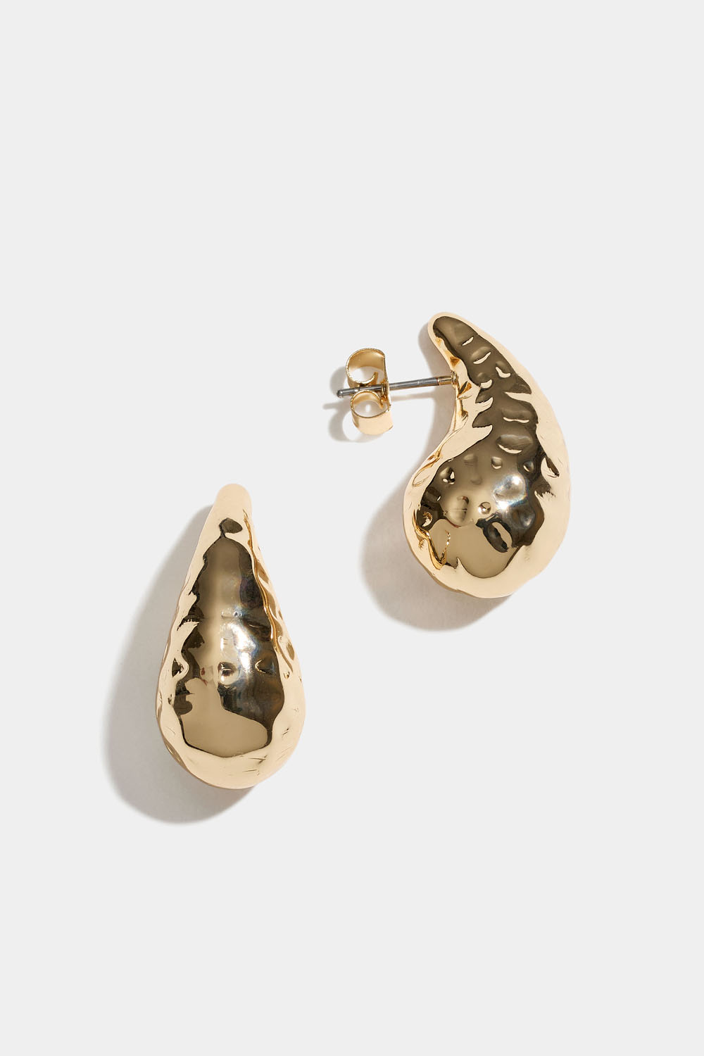 Pisaranmuotoiset taotut korvakorut kullanvärisestä metallista.