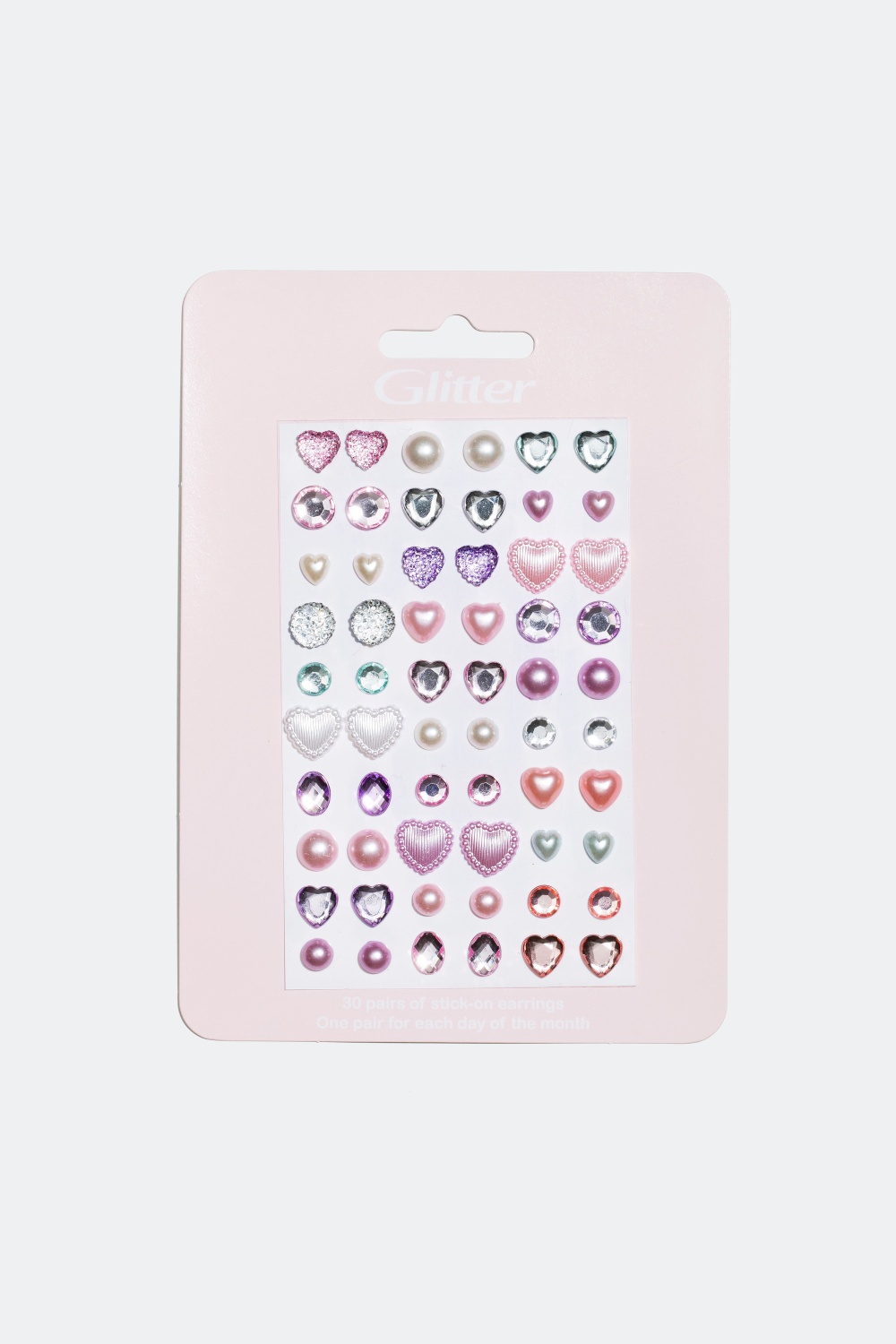 30 tarrakorvakorua, jotka ovat sydämen ja helmen muotoisia erikokoisina ja erilaisilla pintakuvioilla vaaleanpunaisen, violetin, valkoisen ja sinisen sävyissä.