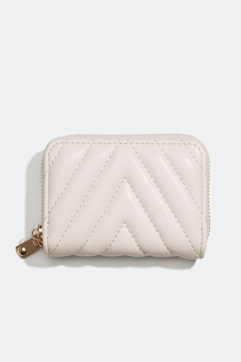 Tikatusta keinonahasta valmistettu valkoinen lompakko korteille ja seteleille. Kätevä pieni lompakko, jossa on kaksi hieman isompaa lokeroa esimerkiksi seteleille ja yhdeksän pienempää korttitaskua. Lompakko sulkeutuu vetoketjulla, joka auttaa pitämään korttisi turvallisesti paikallaan.