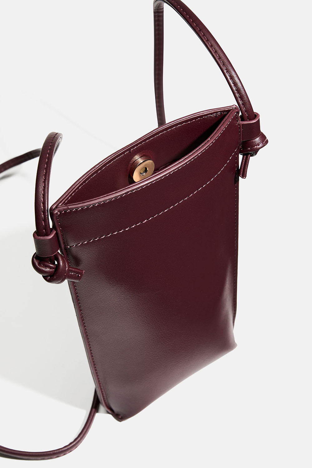 Tyylikäs viininpunaisesta keinonahasta valmistettu kännykkälaukku, joka suljetaan magneetilla. Voidaan käyttää monella tavalla, kaulassa, crossbody-tyyliin tai olalla.