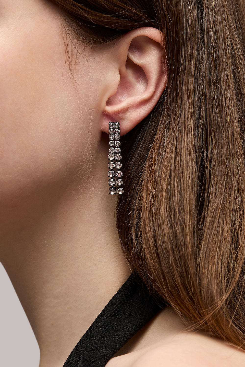 Tummanharmaat roikkuvat korvakorut, joissa on pieniä valkoisia lasikiviä.
