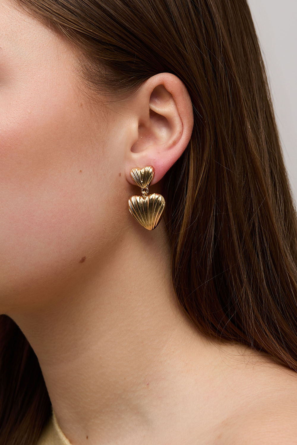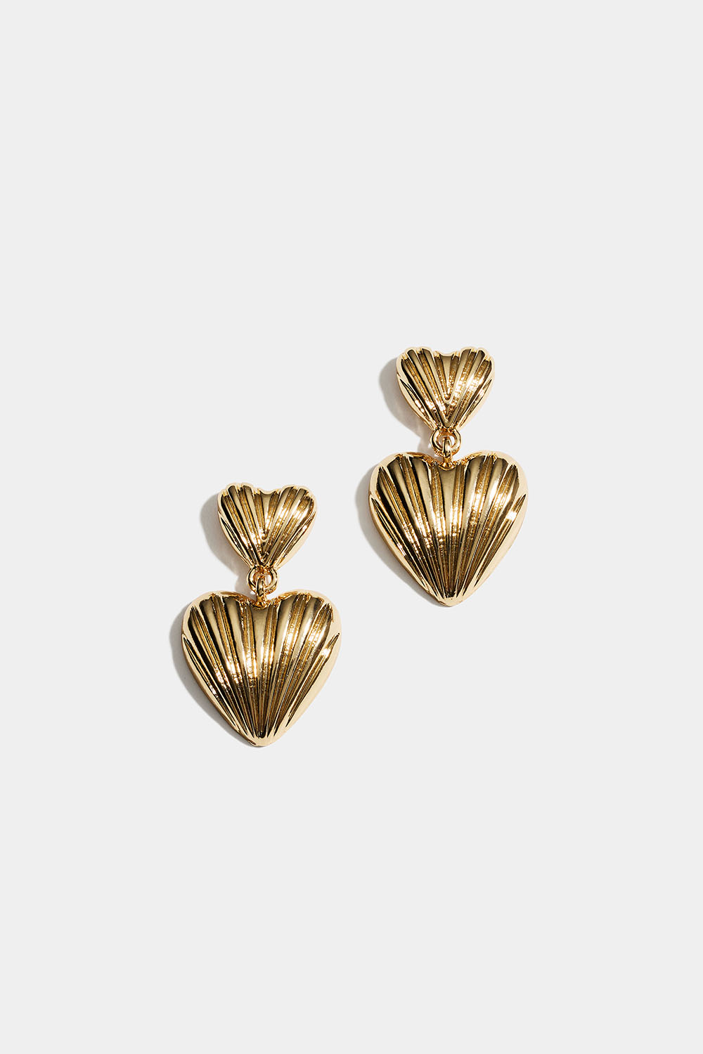Uurretut kullanväriset metallikorvakorut, joissa on kaksi sydäntä.