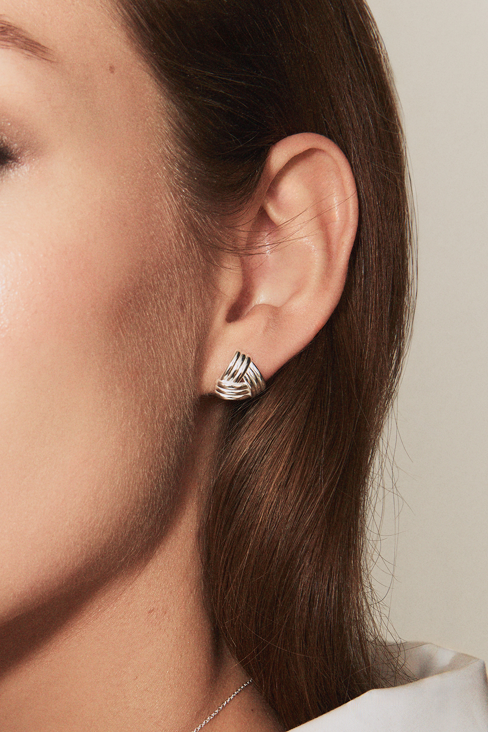 Aidot hopeiset kolmion muotoiset korvakorut, joissa on uurrettu pinta.