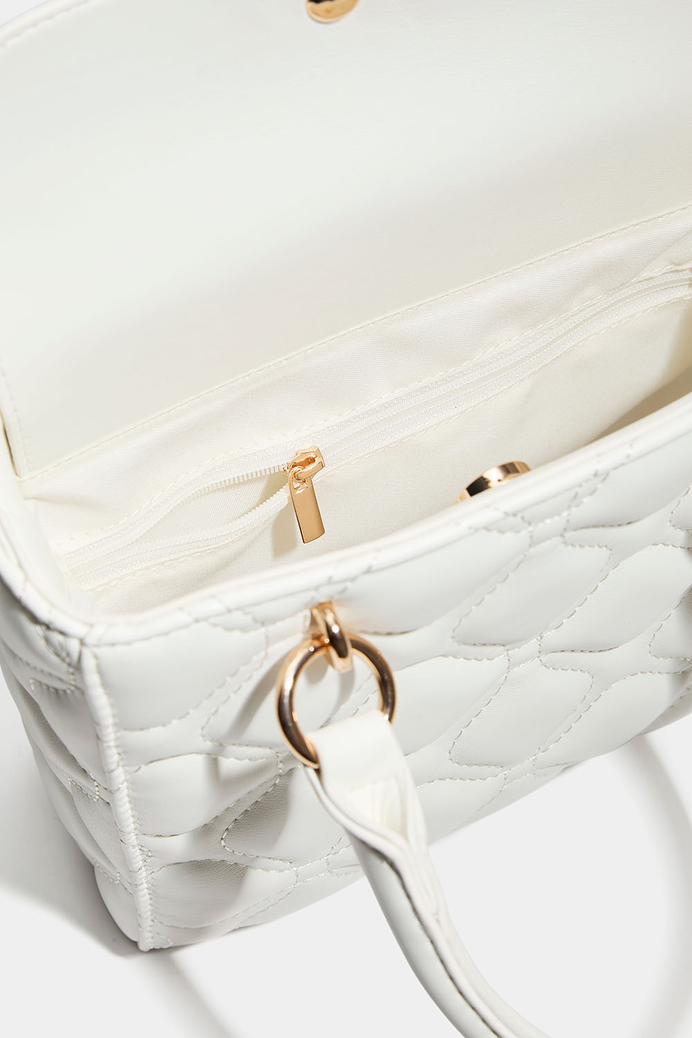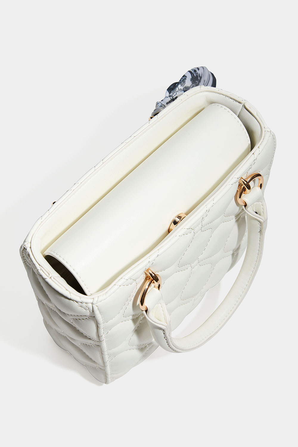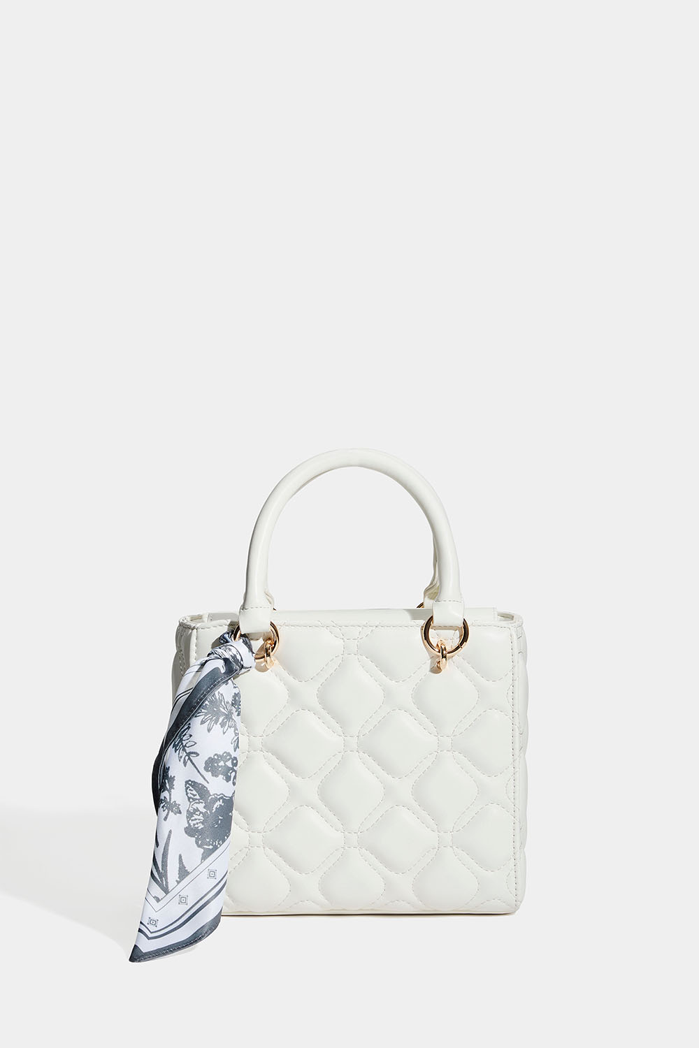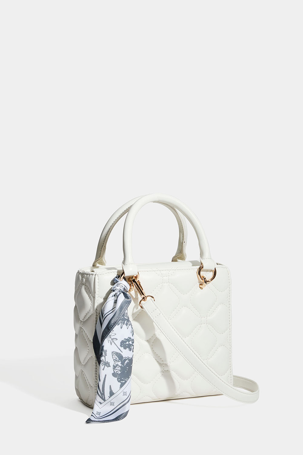 Vaaleanpunainen tikattu laukku, jossa on kaksi kahvaa ja vaaleanpunainen huivi. Laukku suljetaan magneettinapilla ja siinä on pieni sisätasku, jonka voi sulkea vetoketjulla. Laukussa on myös irrotettava olkahihna, joten voit käyttää laukkua olkapäällä tai crossbody-tyyliin.