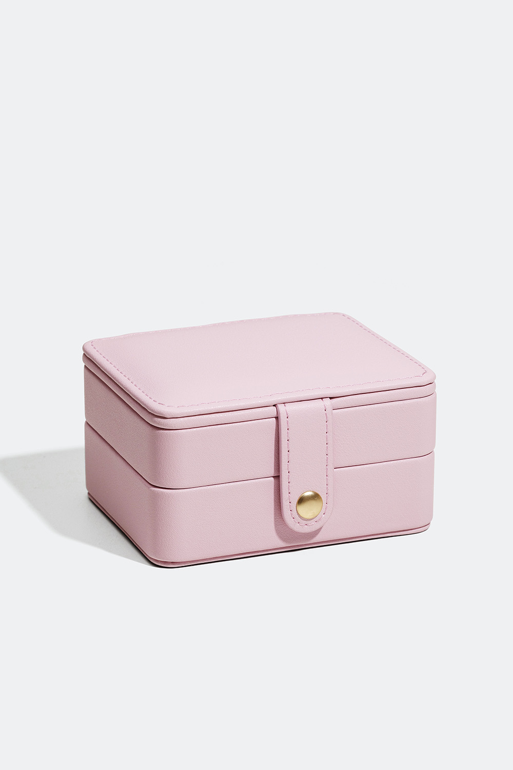 Näppärä, pieni, roosanvärisestä tekonahasta valmistettu matkarasia, jossa on nepparilukko, peili ja samettinen sisäpuoli. Rasia on jaettu kahteen kerrokseen, jossa on useita erilaisia säilytyspaikkoja, ja mukana tulee pidikkeet korvakoruille, kaulakoruille, rannekoruille ja sormuksille. Täydellinen koko tärkeimmille ja eniten käyttämille korullesi niin kotona kuin matkoillakin. Tyylikäs, minimalistisesti muotoiltu korurasia, joka sopii myös tyylikkääksi sisustuksen yksityiskohdaksi ja lahjaksi.
