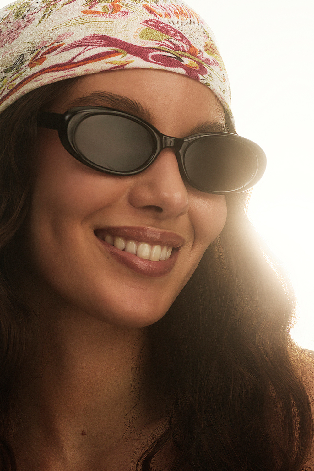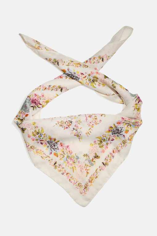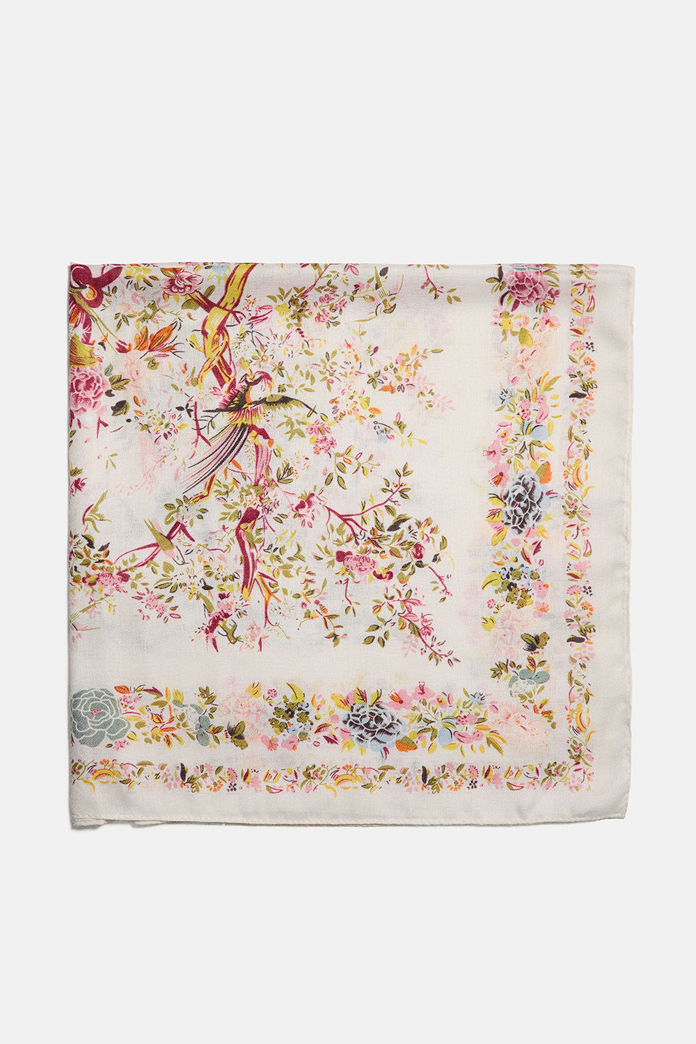 Valkoinen neliönmuotoinen huivi, jossa on luontokuvioita sekä lintu- ja kukkakuvioita.