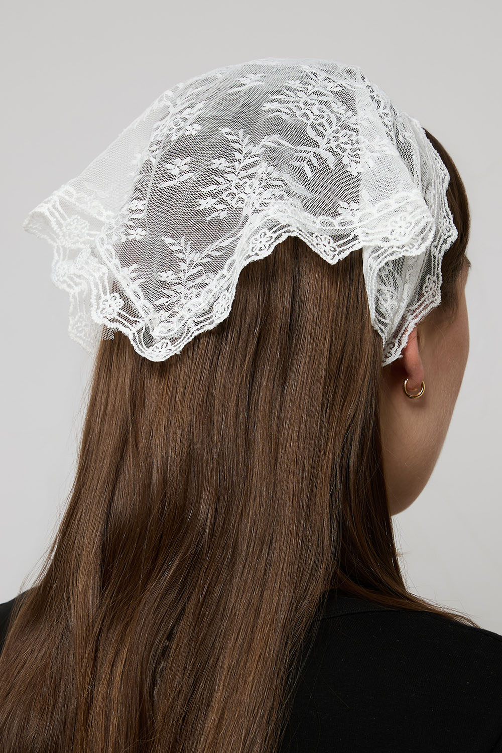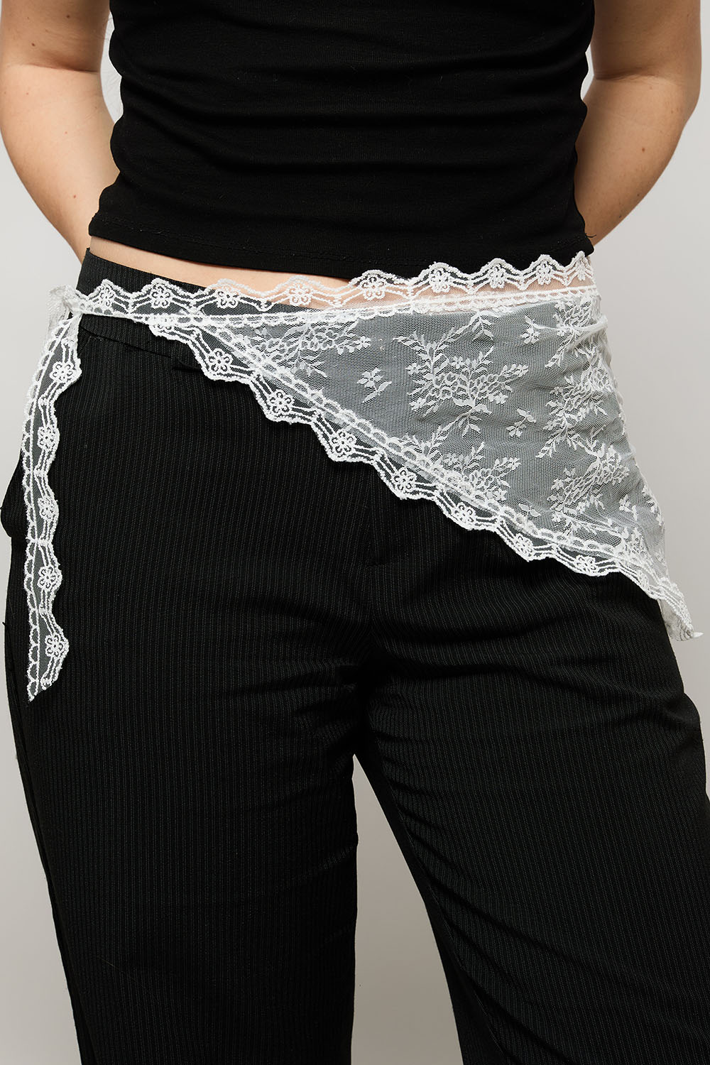 Valkoisesta pitsistä valmistettu kolmion muotoinen huivi. Voidaan käyttää monella tavalla, kaulan ympärillä, hiuspantana tai vyötäröllä.