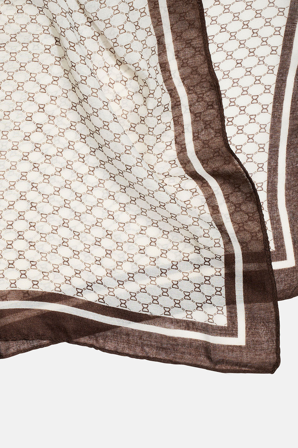Suuri suorakaiteen muotoinen huivi Don Donnalta ohuesta materiaalista, jossa on valkoista ja ruskeaa DD-kuviota.