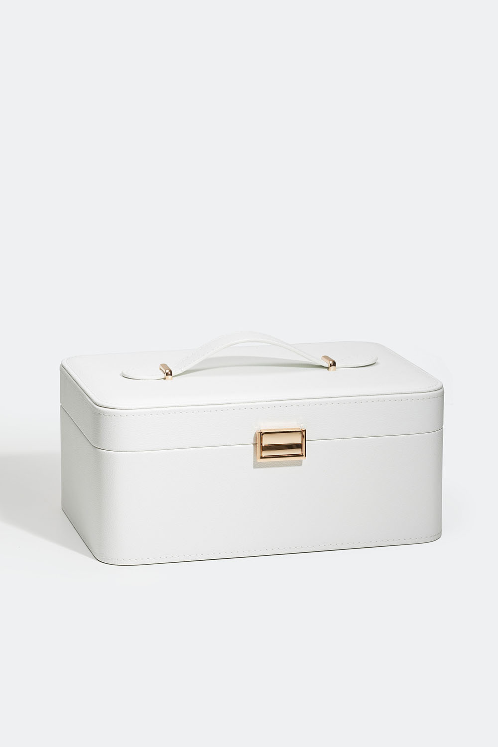 Valkoisesta tekonahasta valmistetussa korurasiassa on kahva sekä peili, ja sen sisäpuoli on tekosamettia. Suuri ja käytännöllinen korurasia, joka on jaettu kahteen kerrokseen ja joka sopii lempikorujesi älykkääseen säilytykseen.