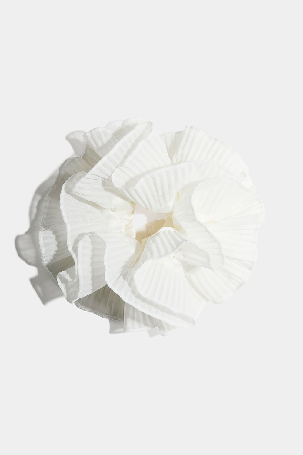 Suuri valkoinen hiusdonitsi valkoista silkkijäljitelmää ja laskostettua tylliä, jossa on ommellut reunat.