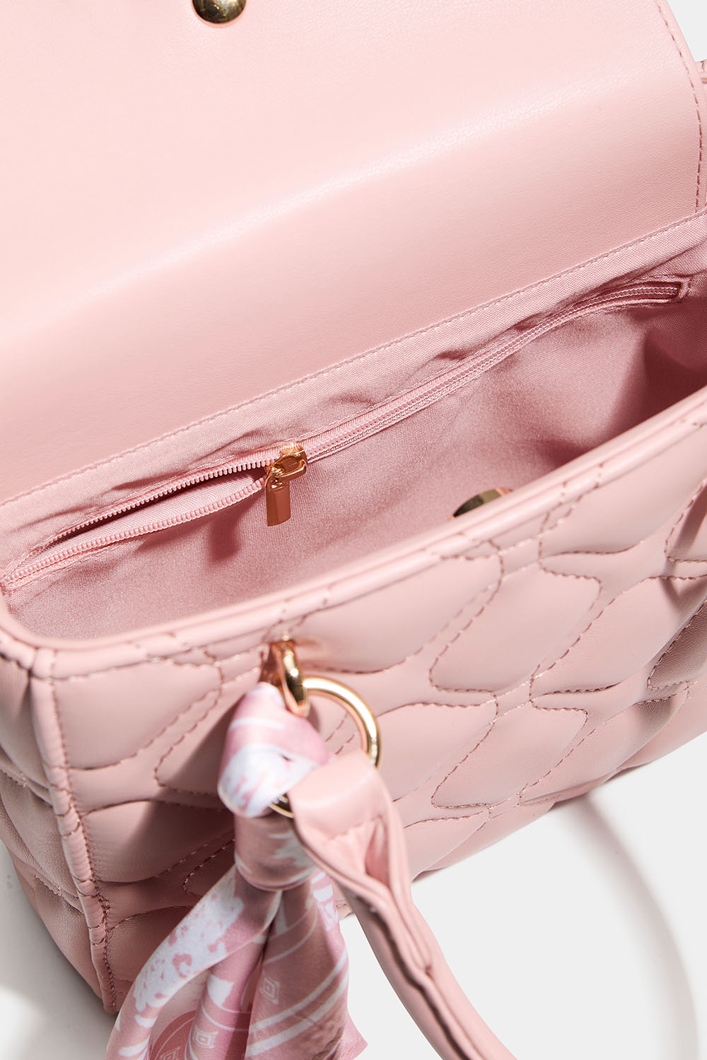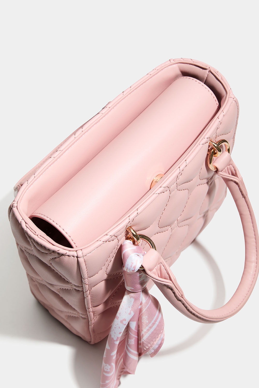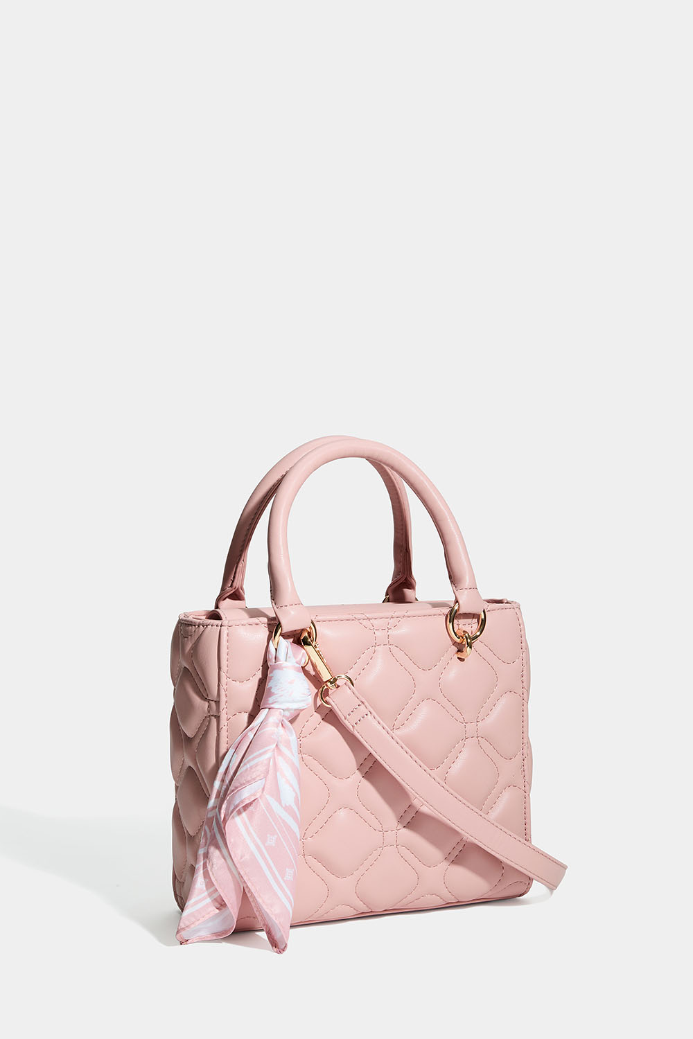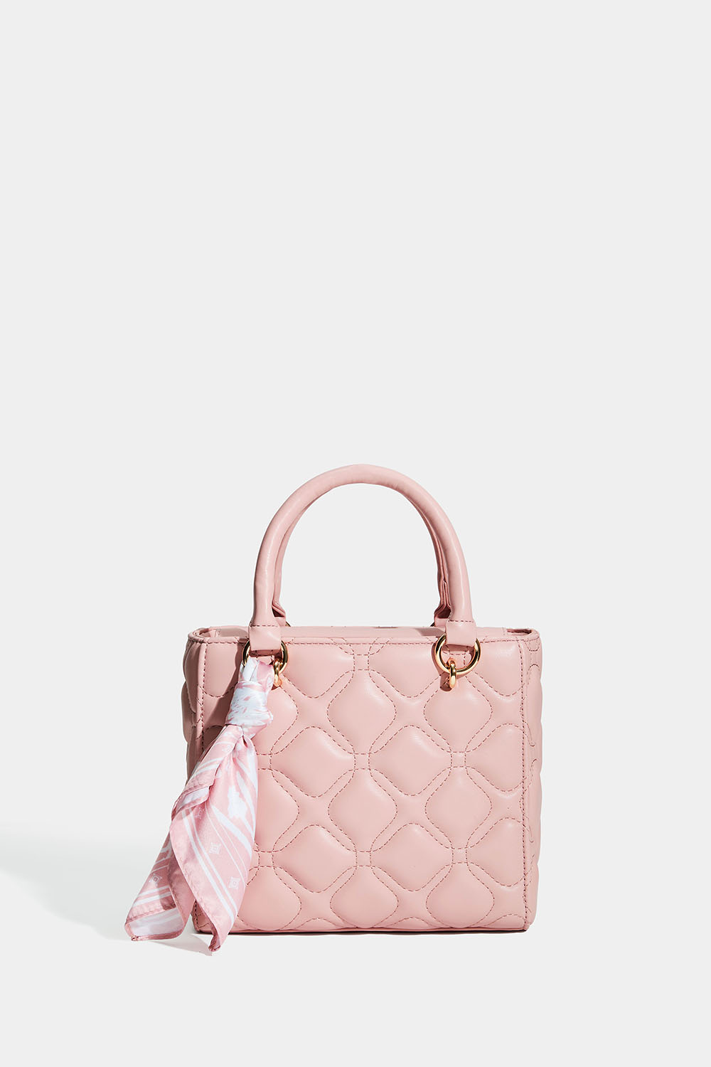 Valkoinen tikattu laukku, jossa on kaksi kahvaa, ja jonka mukana tulee sinivalkoinen huivi. Laukku suljetaan magneettinapilla ja siinä on pieni sisätasku, jonka voi sulkea vetoketjulla. Laukussa on myös irrotettava olkahihna, joten voit käyttää laukkua olkapäällä tai crossbody-tyyliin.