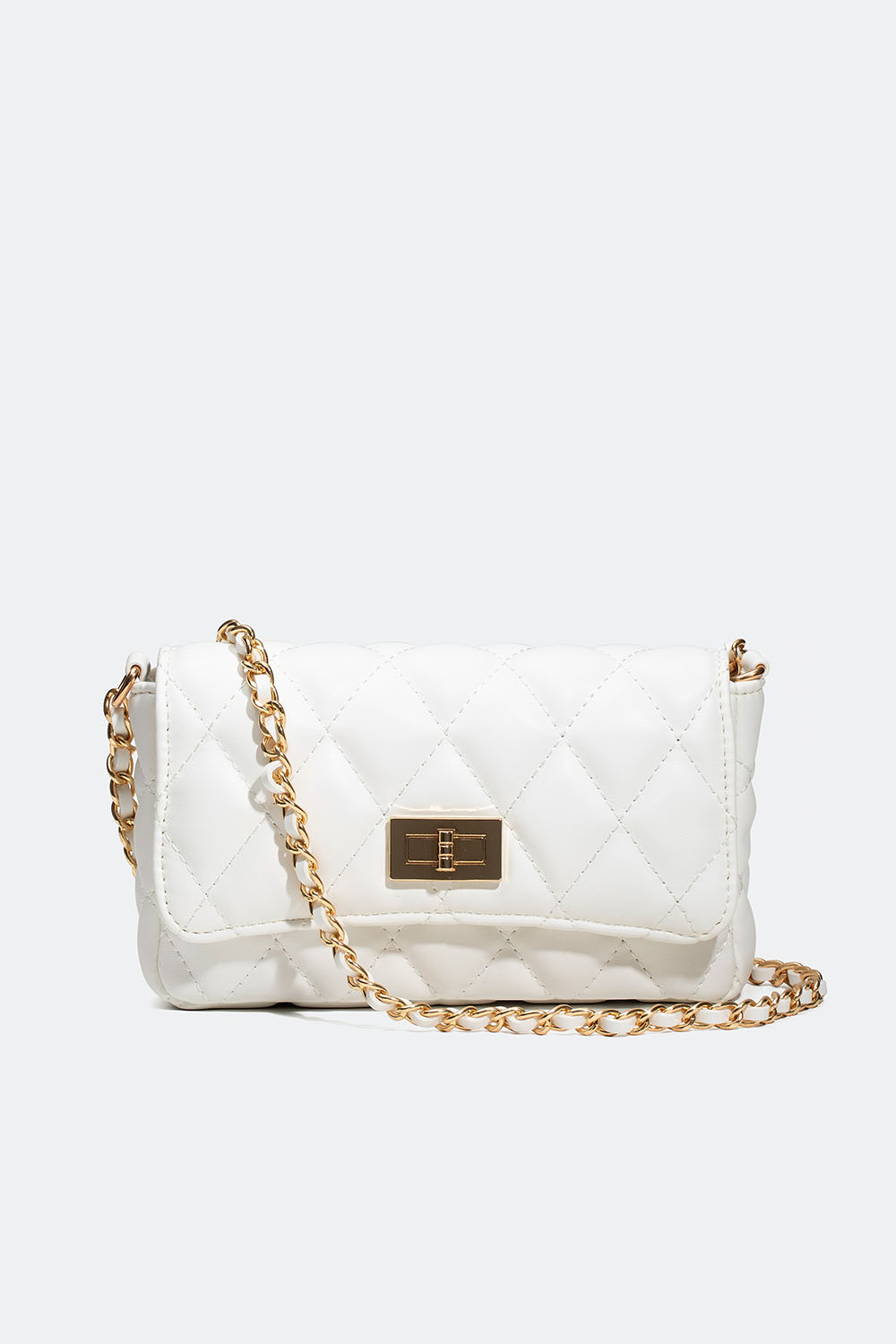 Pieni, valkeasta tikatusta kankaasta keinonahasta valmistettu neliskulmainen olkalaukku, jota voi käyttää myös cross-body-tyyliin. Tyylikäs, valkoisella keinonahalla koristeltu laukku kultaisella olkahihnalla. Laukku suljetaan magneettisoljella, ja sen sisällä on pienempi lokero.