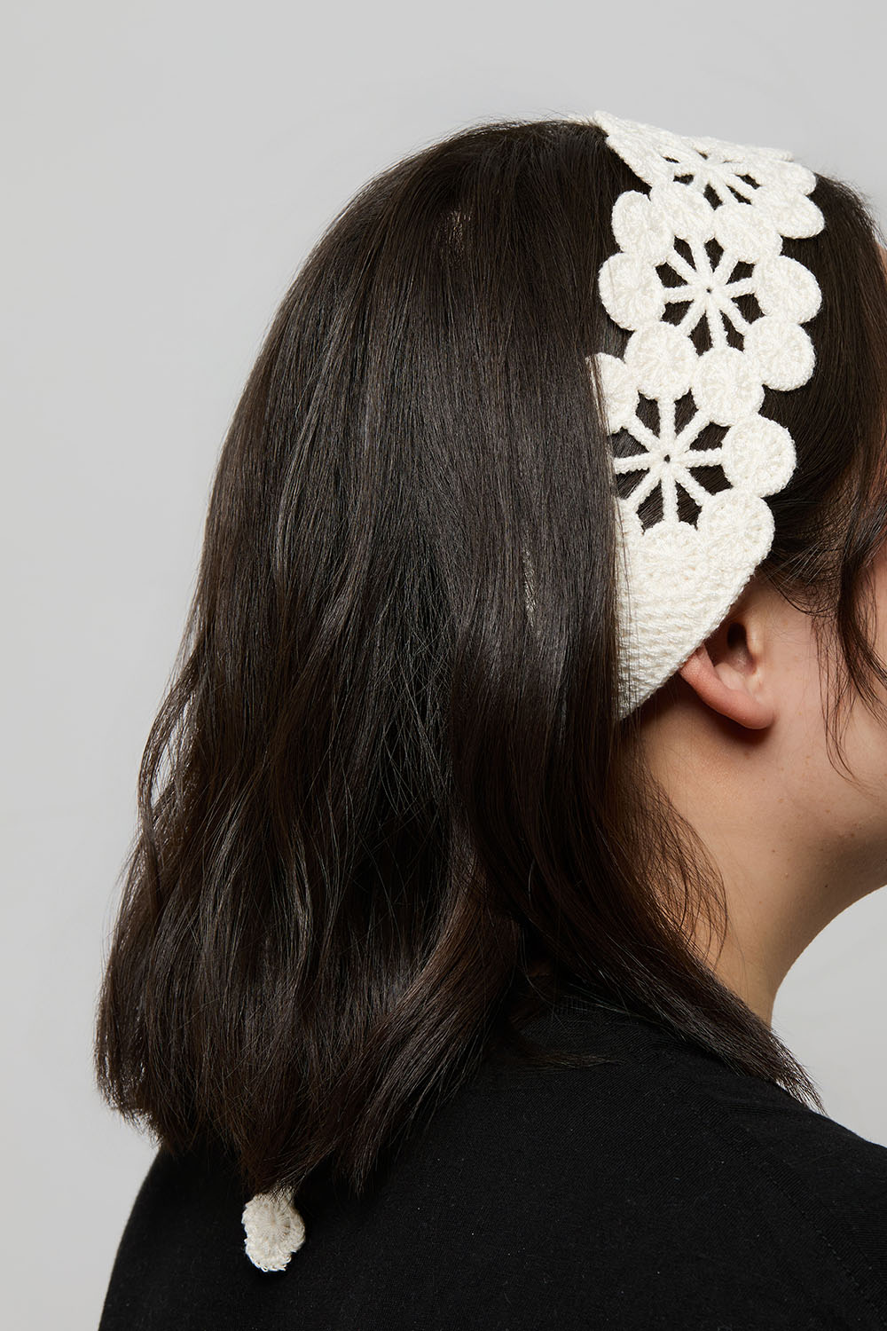 Valkoinen hiuspanta, jossa on virkattuja kukkakuvioita.