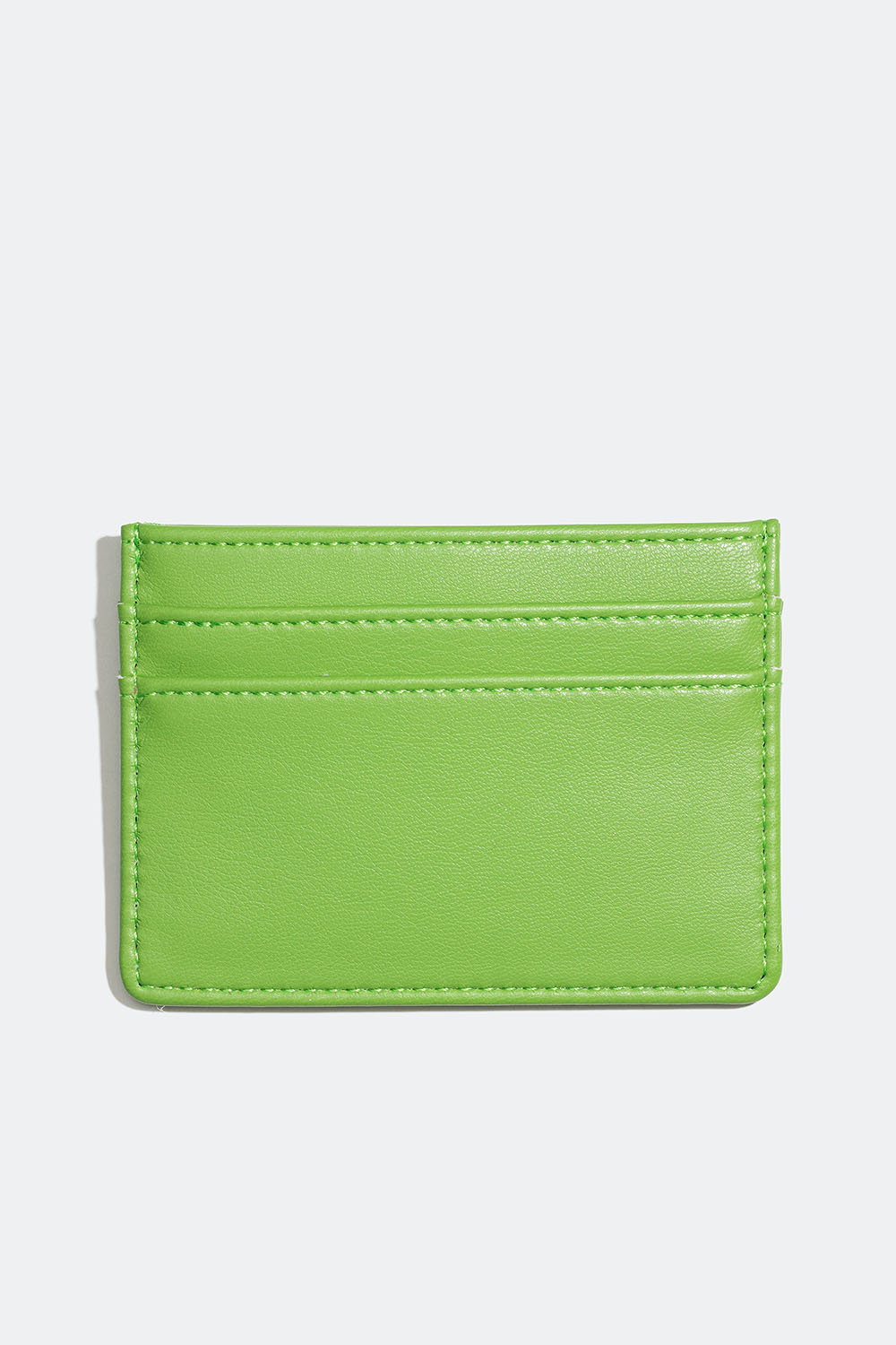 Vihreä korttikotelo tekonahkaa. Käytännöllinen pieni lompakko, jossa on keskellä neljä korttilokeroa ja hieman suurempi lokero esimerkiksi korteille tai seteleille.