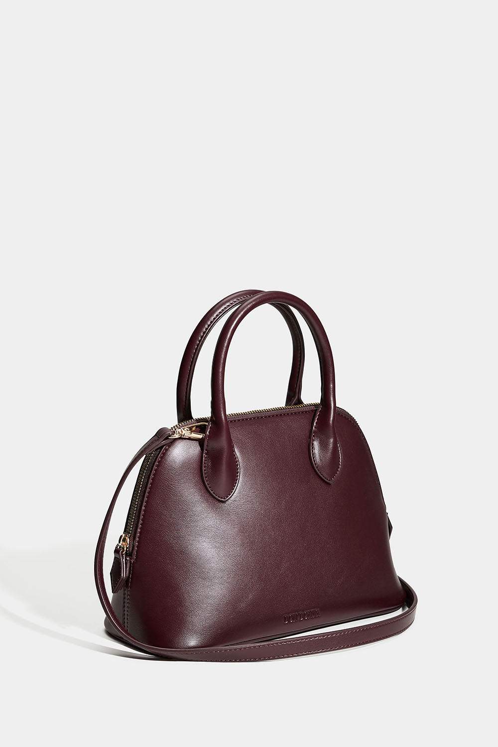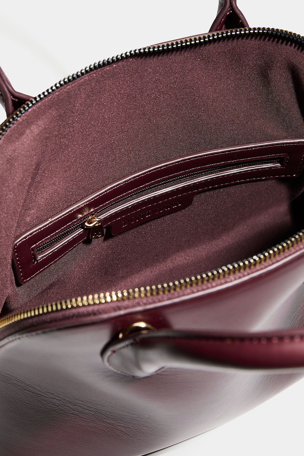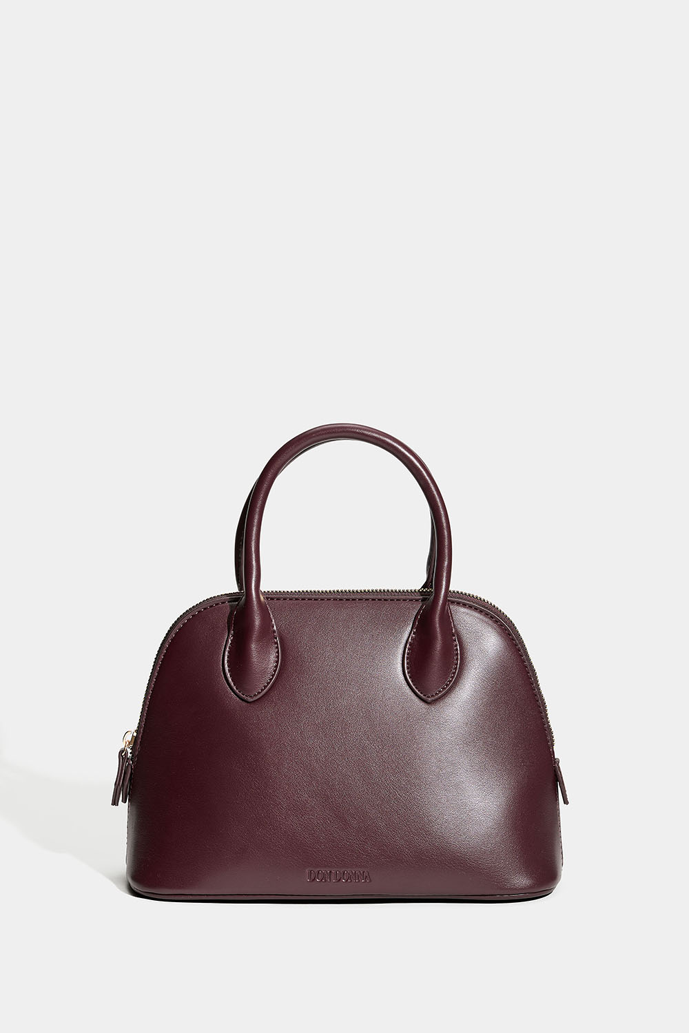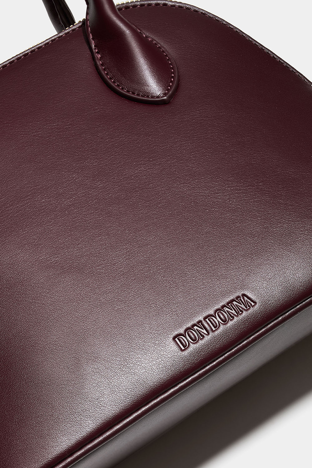 Keilalaukku viininpunaista tekonahkaa, jossa on kultaisia yksityiskohtia ja Don Donna -logo kohokuvioituna toisella puolella. Laukku suljetaan vetoketjulla, ja sen sisäpuolella on pieni lisälokero, joka suljetaan vetoketjulla. Laukussa on irrotettava olkahihna, joten voit käyttää sitä myös olan yli tai crossbody-laukkuna.