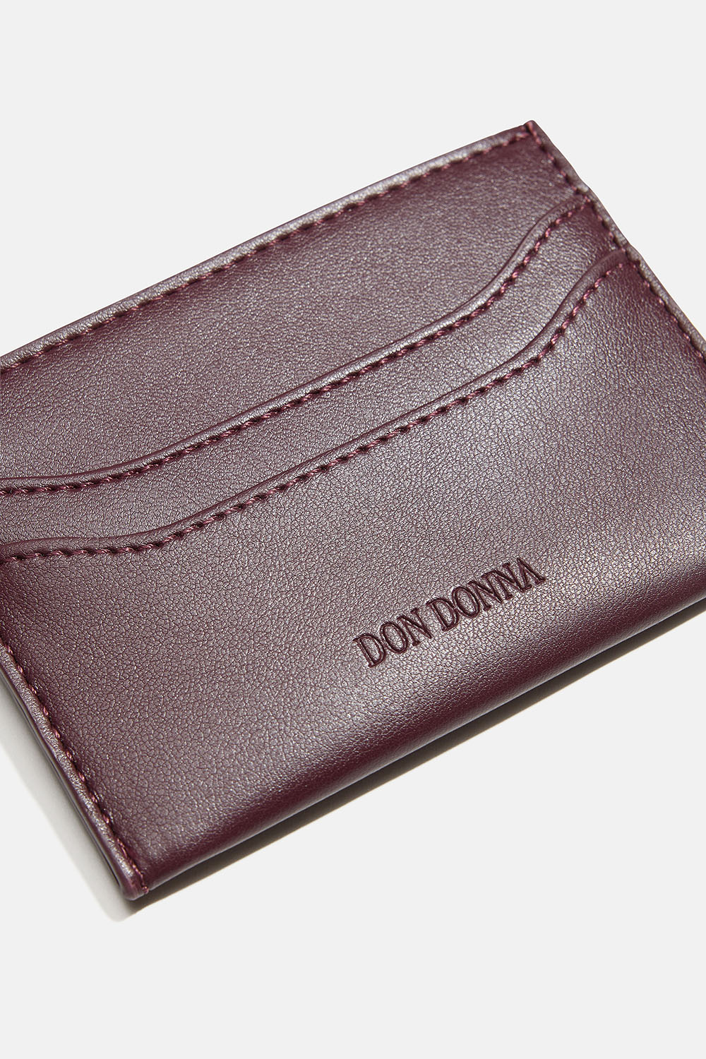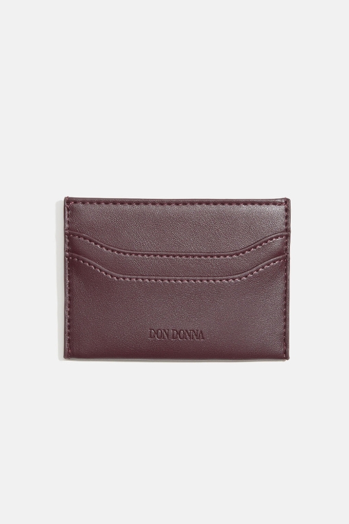 Tyylikäs viininpunaisesta keinonahasta valmistettu korttikotelo, jonka etupuolella on Don Donna -logo. Käytännöllinen pieni lompakko, jonka molemmilla sivuilla on kaksi taskua ja keskellä hieman suurempi tasku esimerkiksi kortteja tai seteleitä varten. Sopii täydellisesti yhteen Don Donna -laukkujemme kanssa.