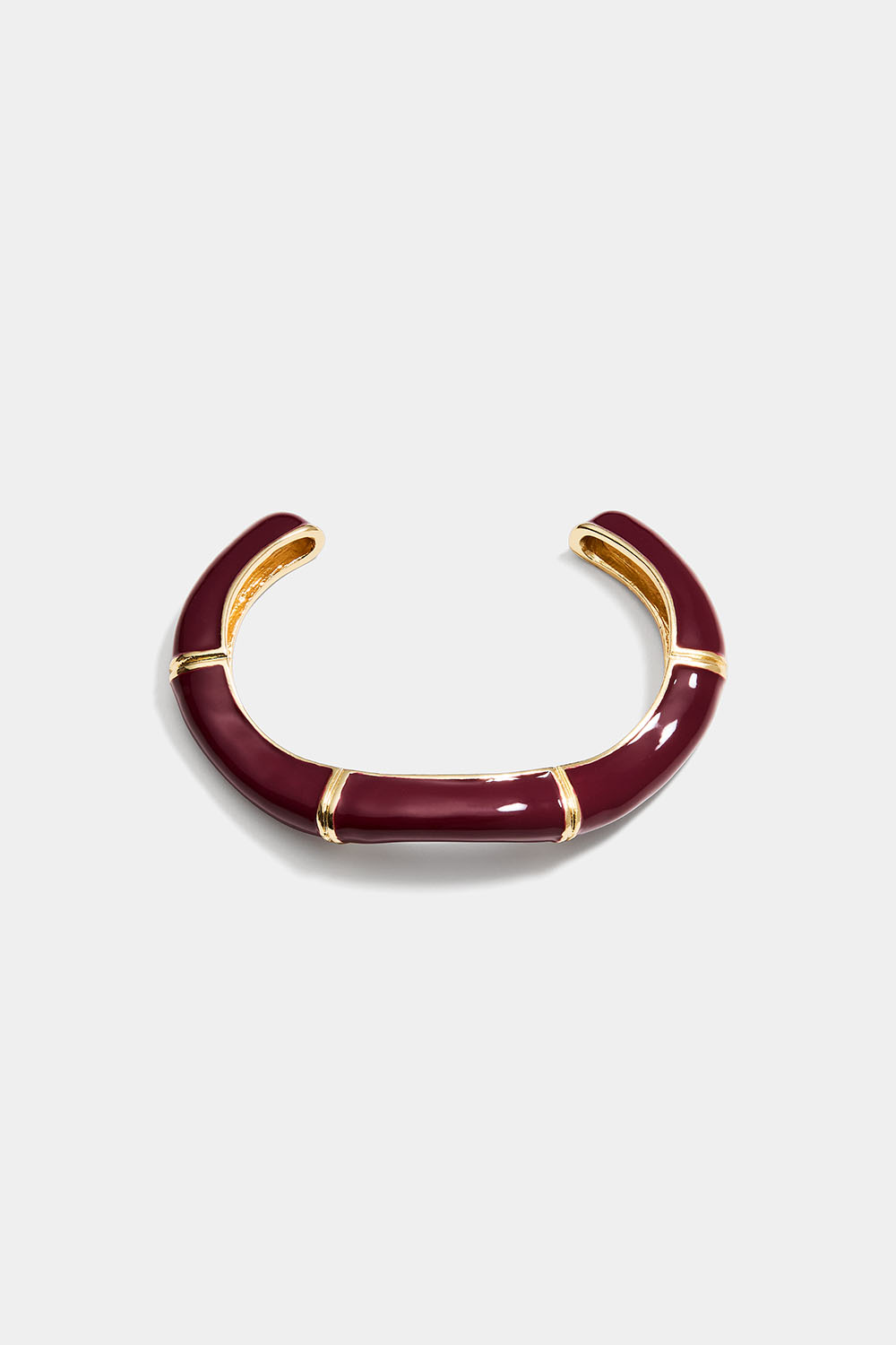 Viininpunainen rannerengas, jossa orgaaninen muoto ja kullanvärisiä raitoja.