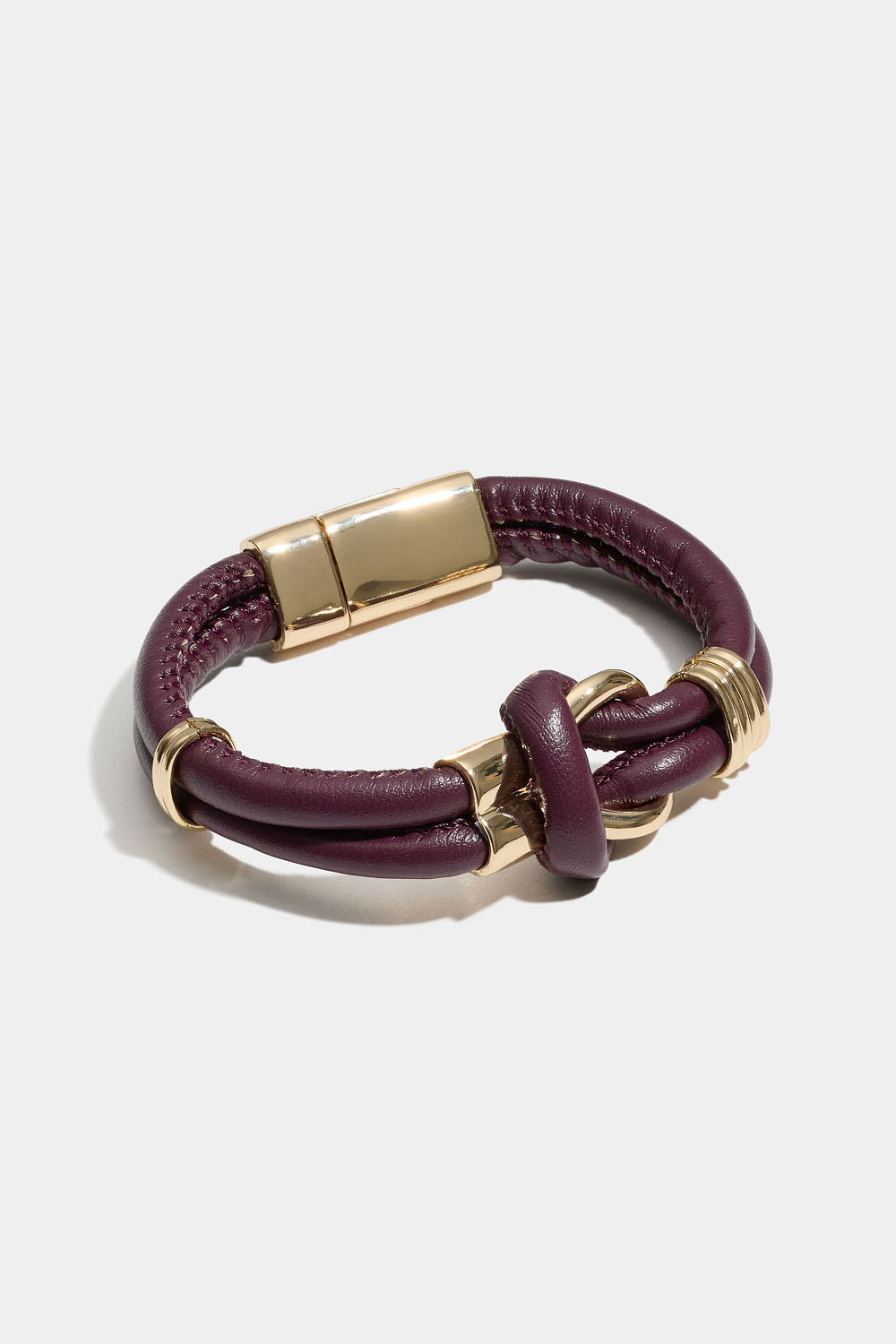 Viininpunainen keinonahkainen rannekoru, jossa on solmu ja kullanvärisiä yksityiskohtia. Rannekoru aukeaa magneetilla.